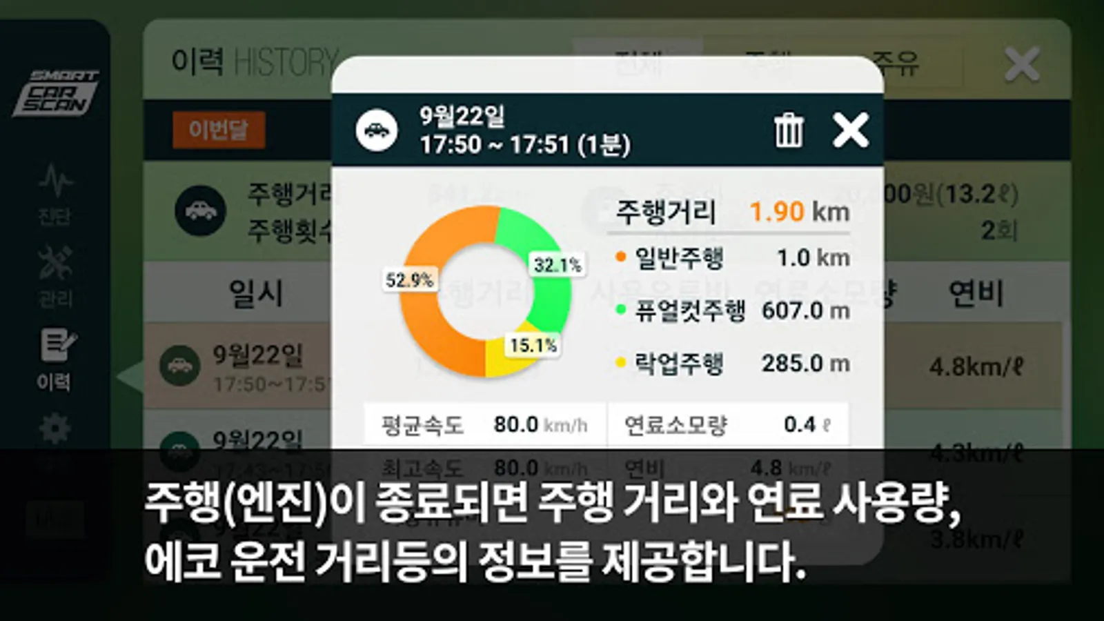주행이 끝나면 자동으로 주행한 내역(주행 거리, 시간, 연료 사용량, 연비, 주행 스타일)을 저장하고