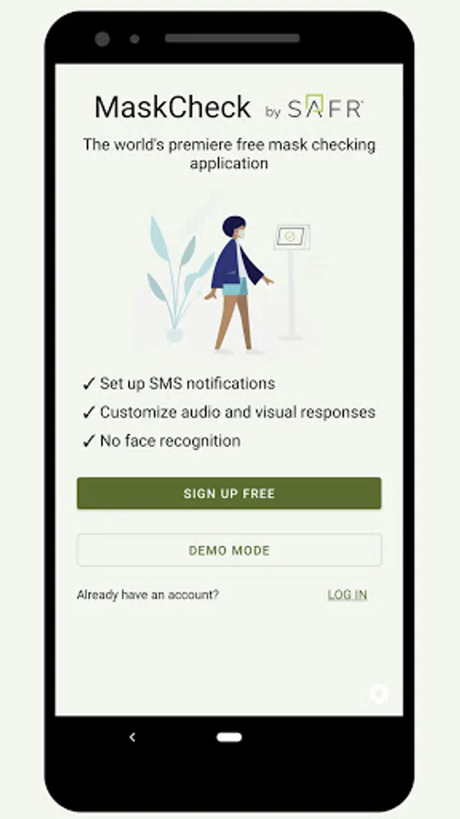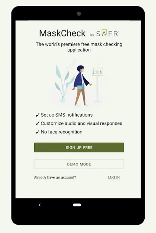 MaskCheck™ by SAFR® is a mask detection app created to encourage and track the use of face masks in shared spaces. It uses the power of AI through computer vision to automatically, quickly, and safely determine if a person is wearing a mask or not. If a mask is detected, the app can also determine if the mask is worn appropriately (covering both mouth and nose) or if it needs to be adjusted. MaskCheck is designed to be used via a mounted mobile device or tablet as a self-service automated mask detection kiosk.