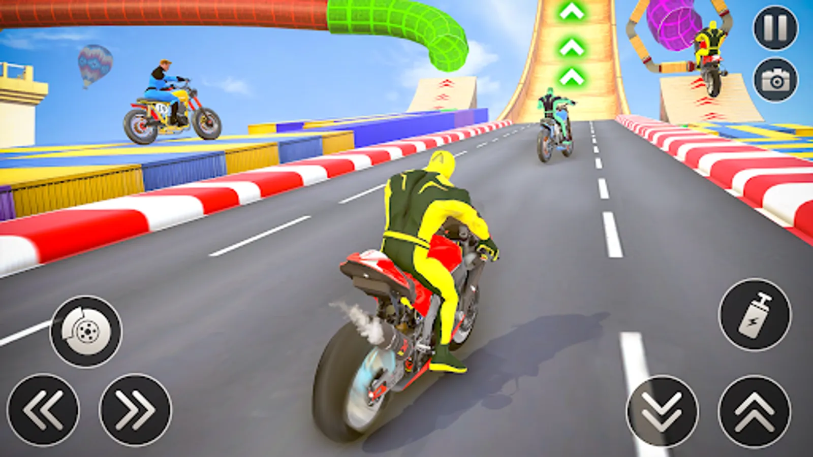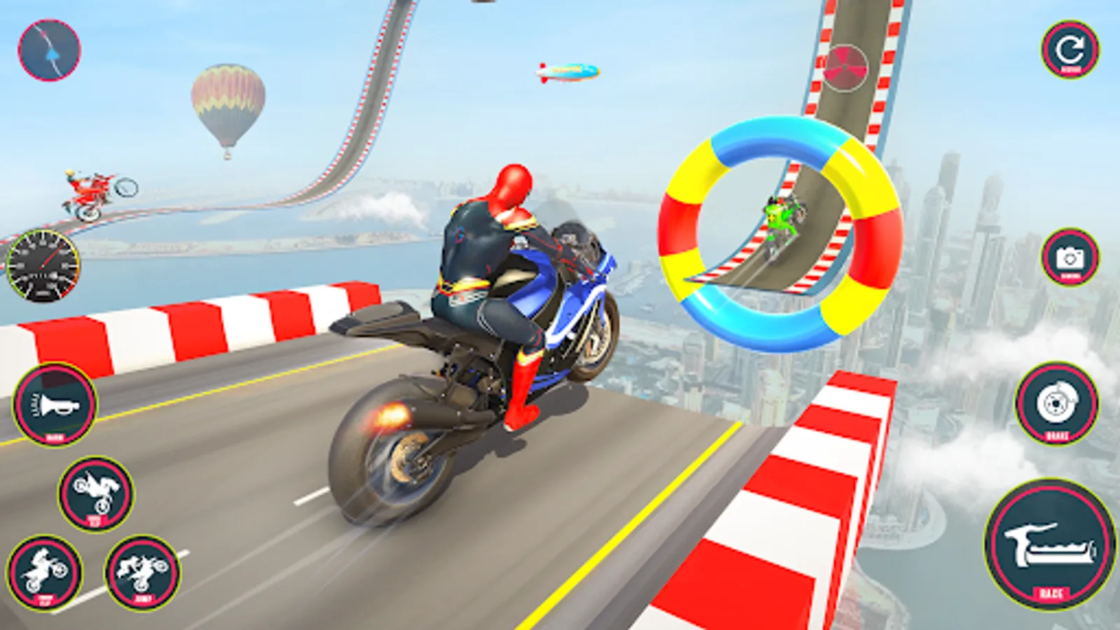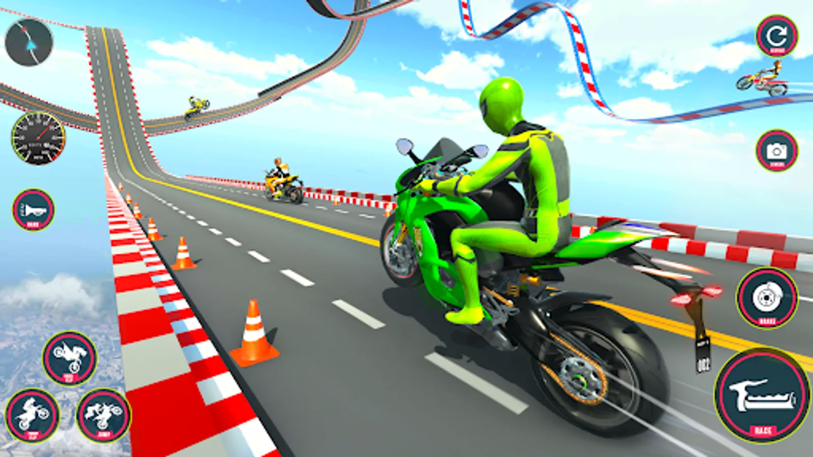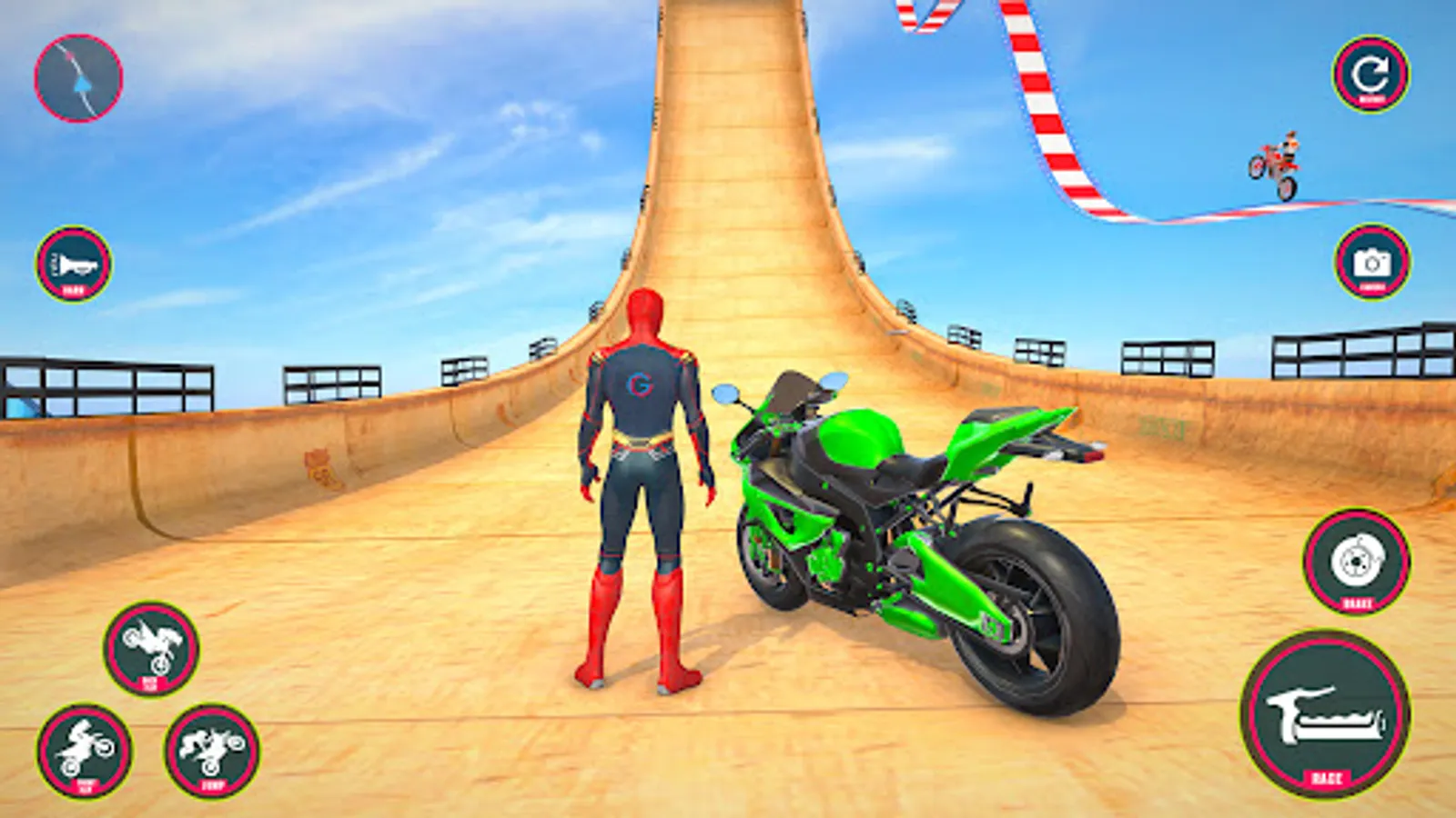 Experience realistic environments, luxury heavy bikes, and stunning 3D graphics to fulfill your zeal for bike rush stunts. Show your superhero bike racing games skills by executing impossible mega ramp stunts in racing simulation games. Select your luxury moto bike and enter into the world of bike stunt games to make new records on superhero impossible tracks games. Don’t be off track even for a second and focus on your goals in motorcycle simulator games 3d.