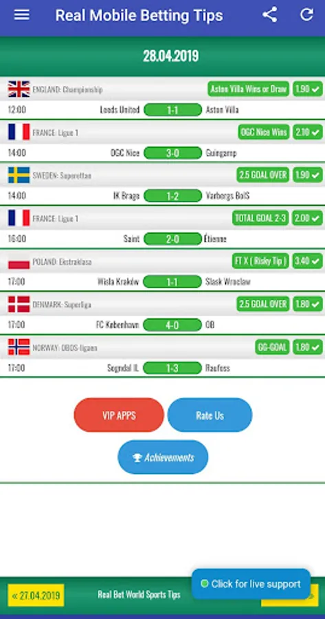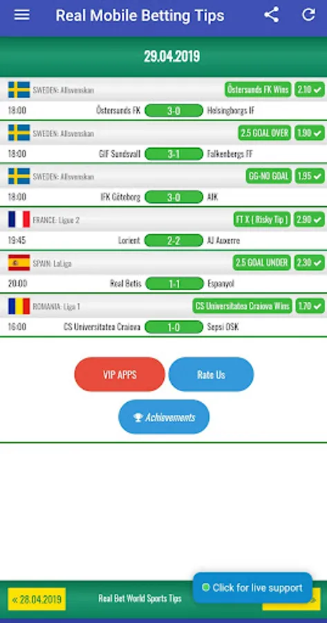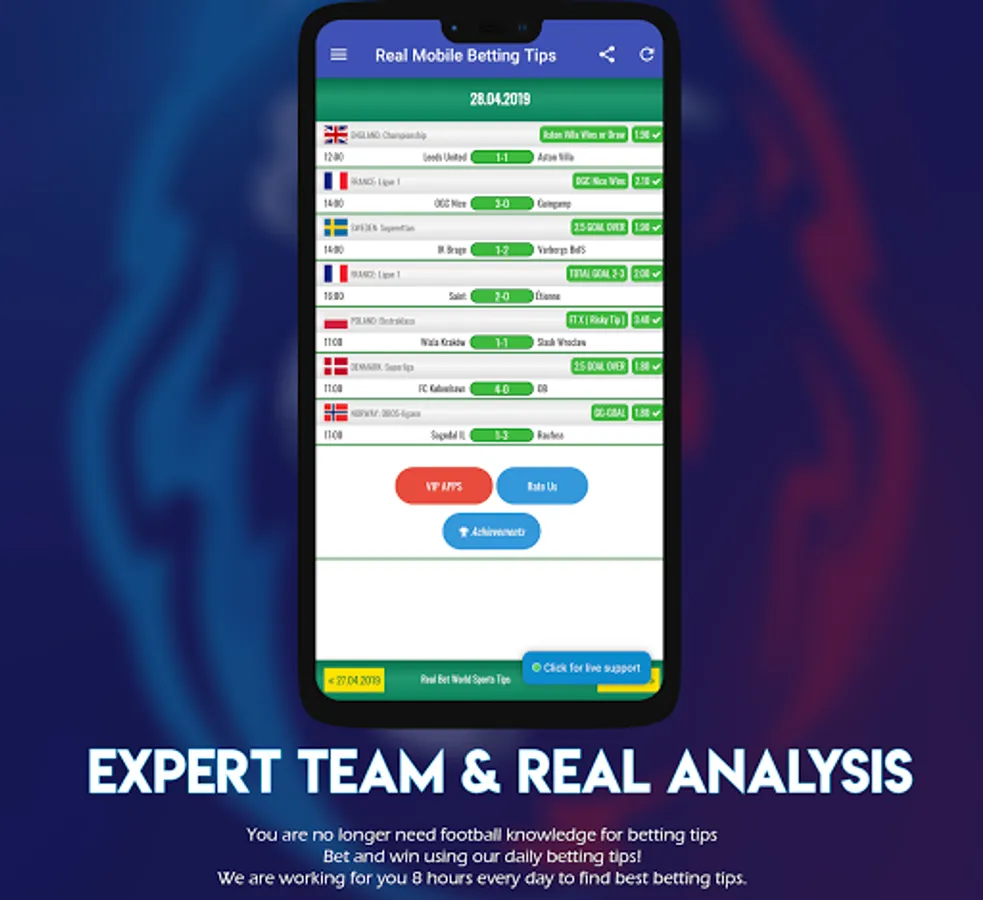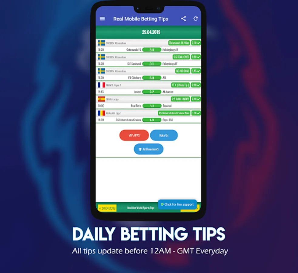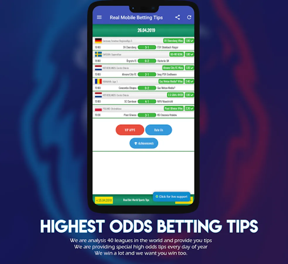 If you wish to have high odds, you can purchase one time our Real Bet VIP World Sports Betting Tips application and use it life time. Real Bet VIP World Sports Betting Tips application provides sure betting tips and wins always.