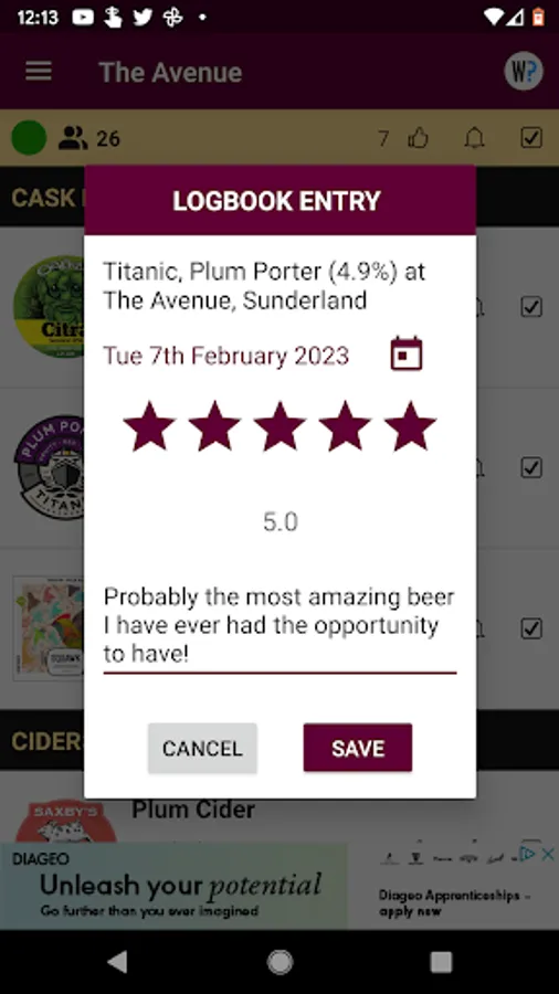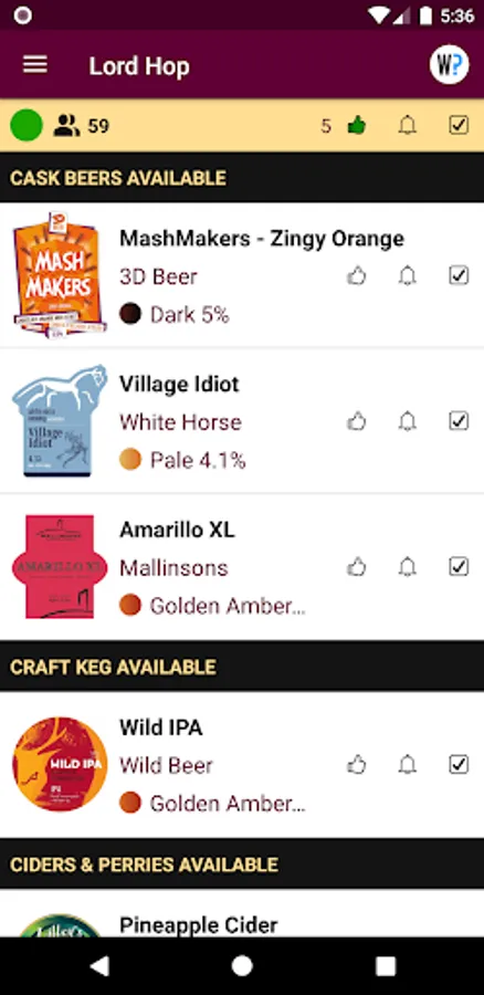 Follow your local pub to favourites and get a notification when a new beer or cider comes on. Get an alert when one of your favourite beers or ciders is available nearby. Browse comprehensive tasting notes and pump clip images of available beers and check out the live map showing you beers and ciders available nearby. Link to CAMRA What Pub for detailed pub information and to score beers.
