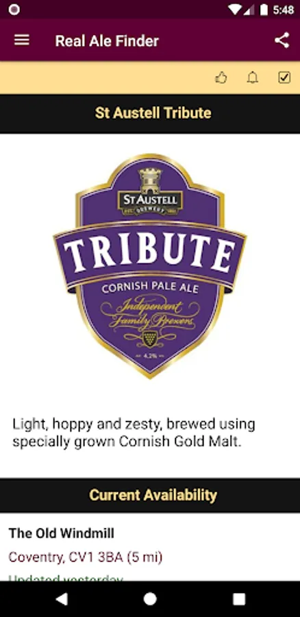 Features: Live beer board for participating pubs, comprehensive brewery and beer database with clips and tasting notes, personal rating log book, pub and beer alerts, live map, events