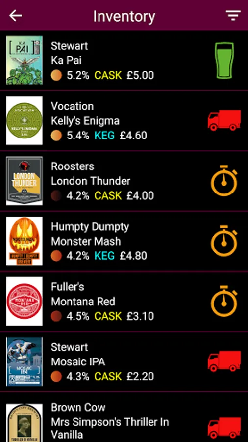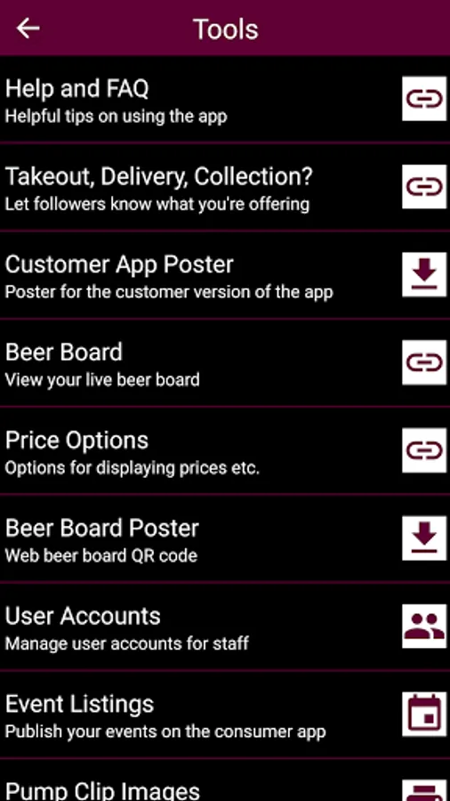 This app allows the pub to manage their inventory and share updates easily on social media. We also provide a suit of tools and reports and also provide a feed for an in-pub TV screen. Other useful tools such as printing pump clips, tasting note cards are also included.