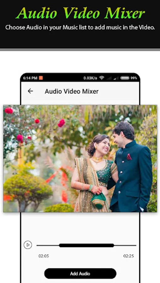 Audio Video Mixer or Add Audio to Video or Mix Audio with Video app to change audio of a video.