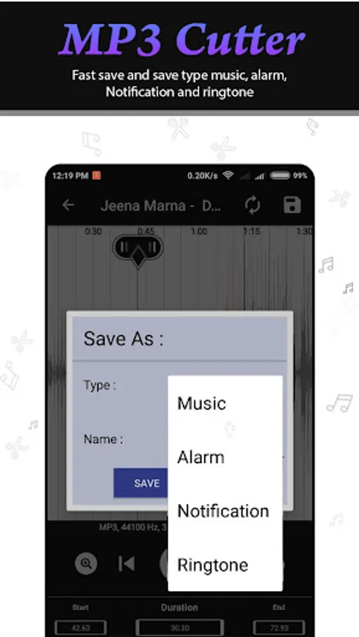 - Option to Name the new cut clip while saving it as SD Card/Ringtone Maker Folder.