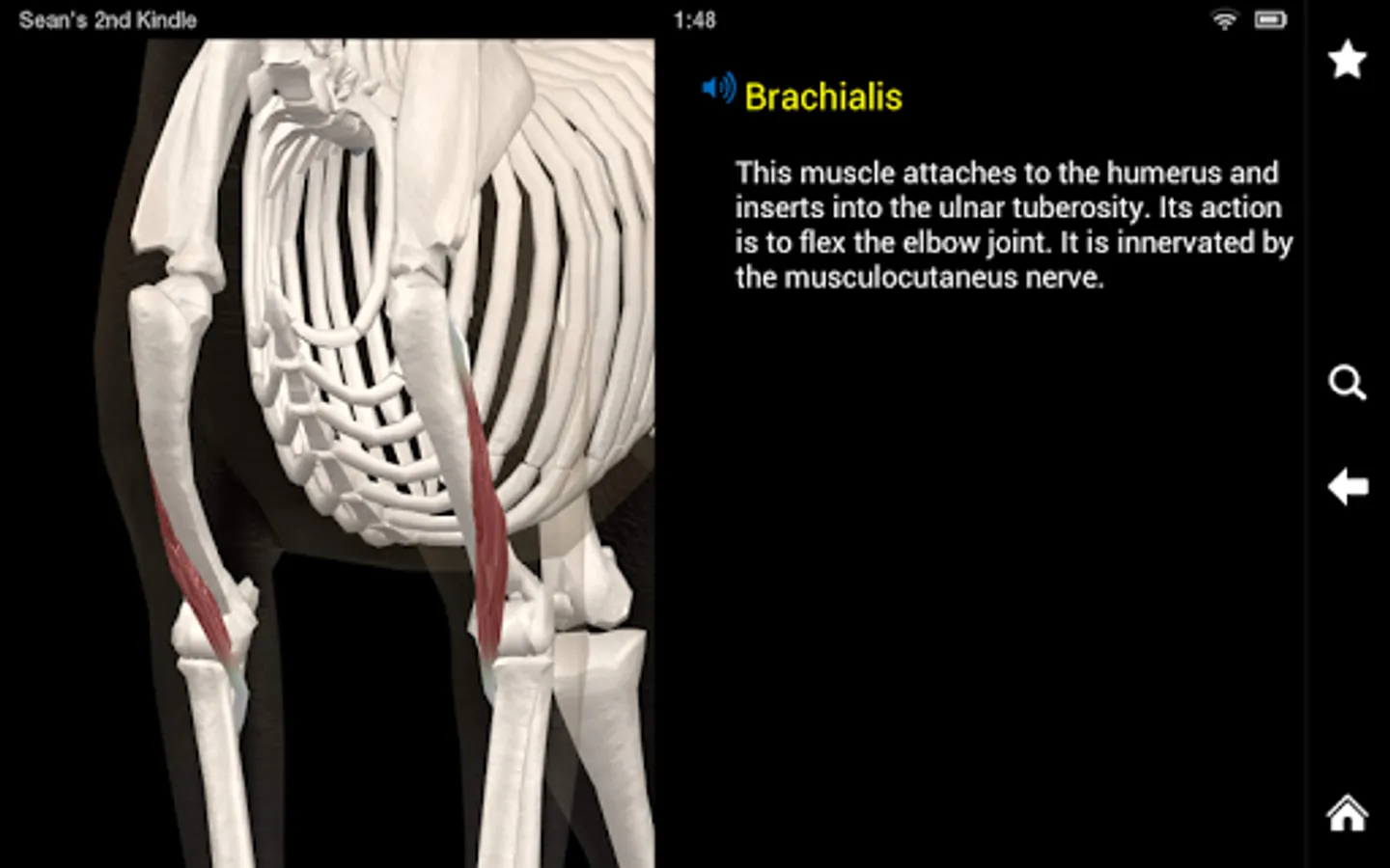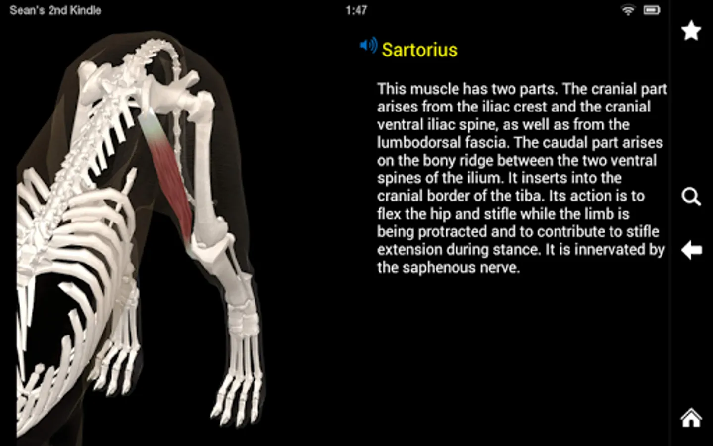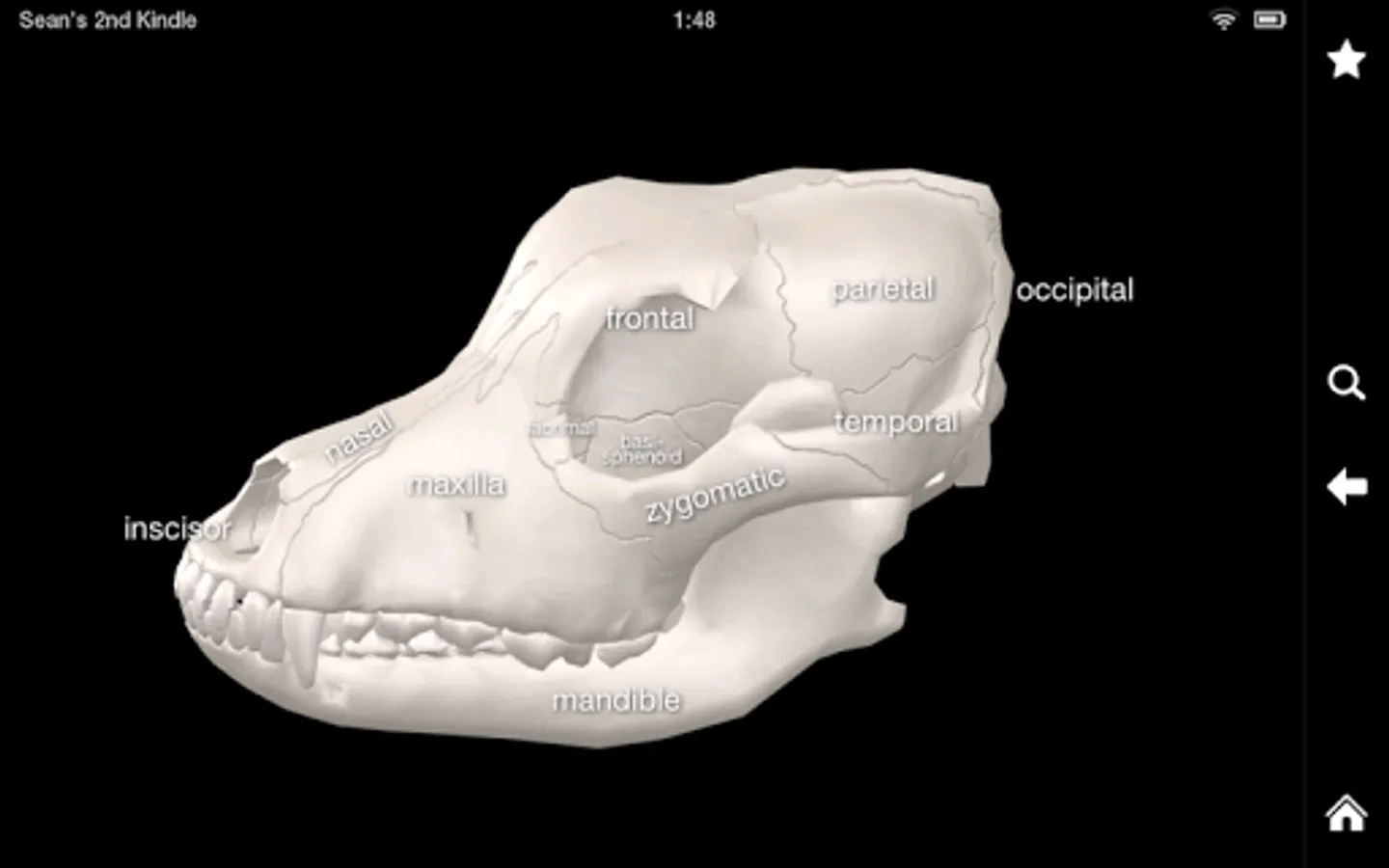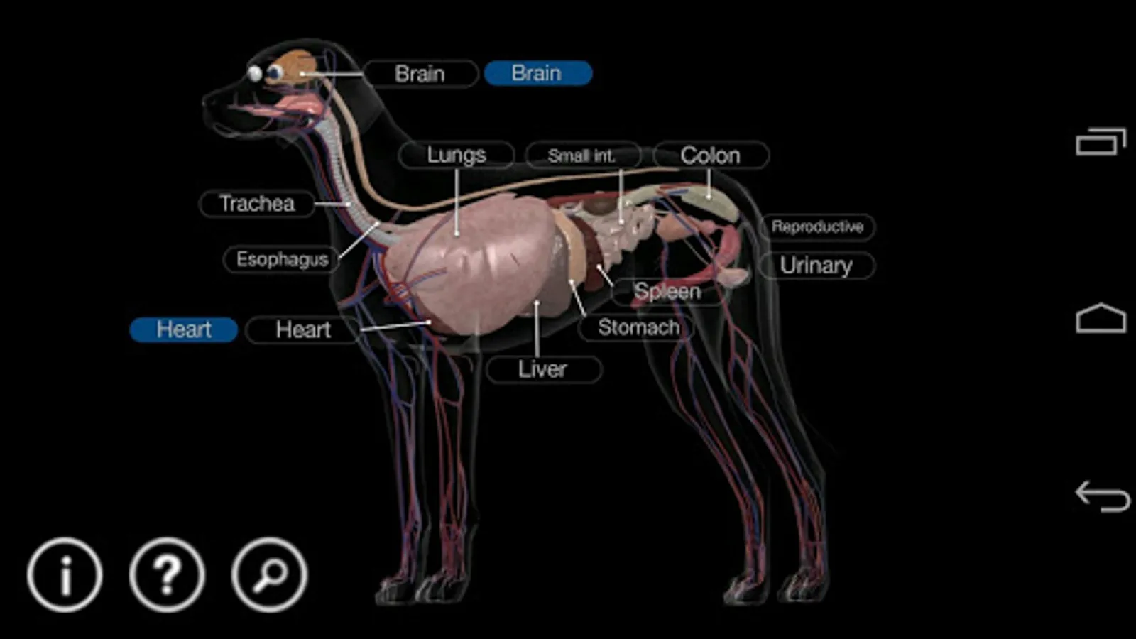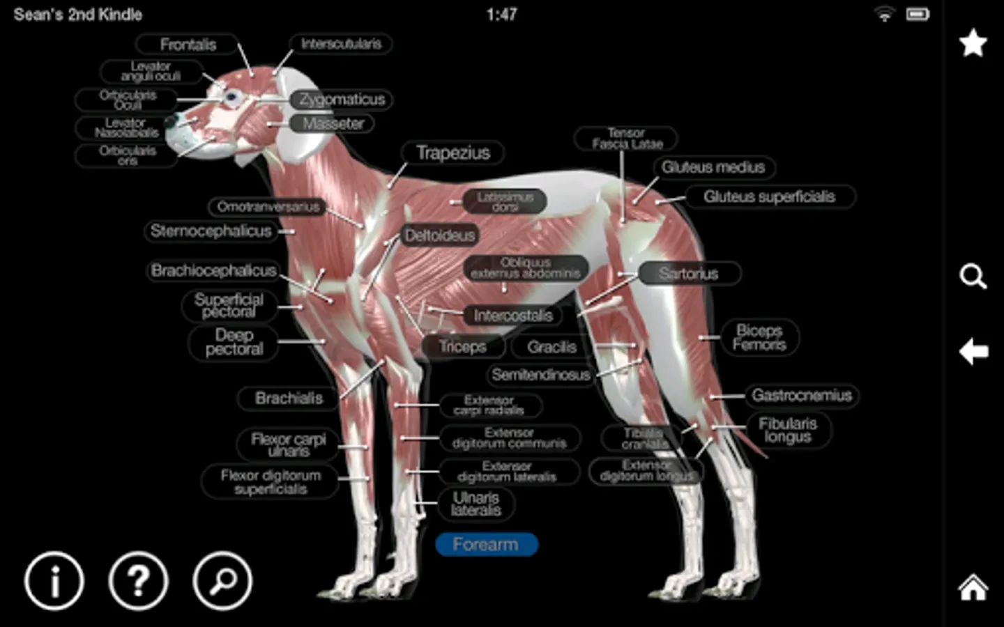 A fantastic, interactive visual reference with over 300 anatomical structures. Rotate the model, cut down through layers, or zoom in. Tap the labels to get details of each structure with audio pronunciation, text descriptions and a close-up view. This app covers the superficial landmarks, most superficial and deep muscles, bones, and organs. Quiz yourself on each section, make your own quiz, or have the app quiz you on just what you missed. If you want to understand canine anatomy, this app is for you.