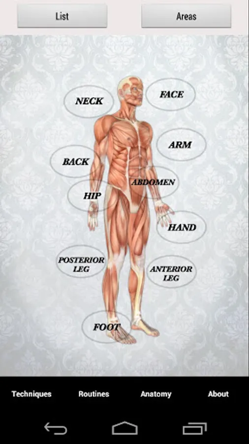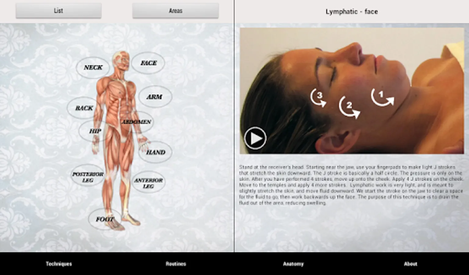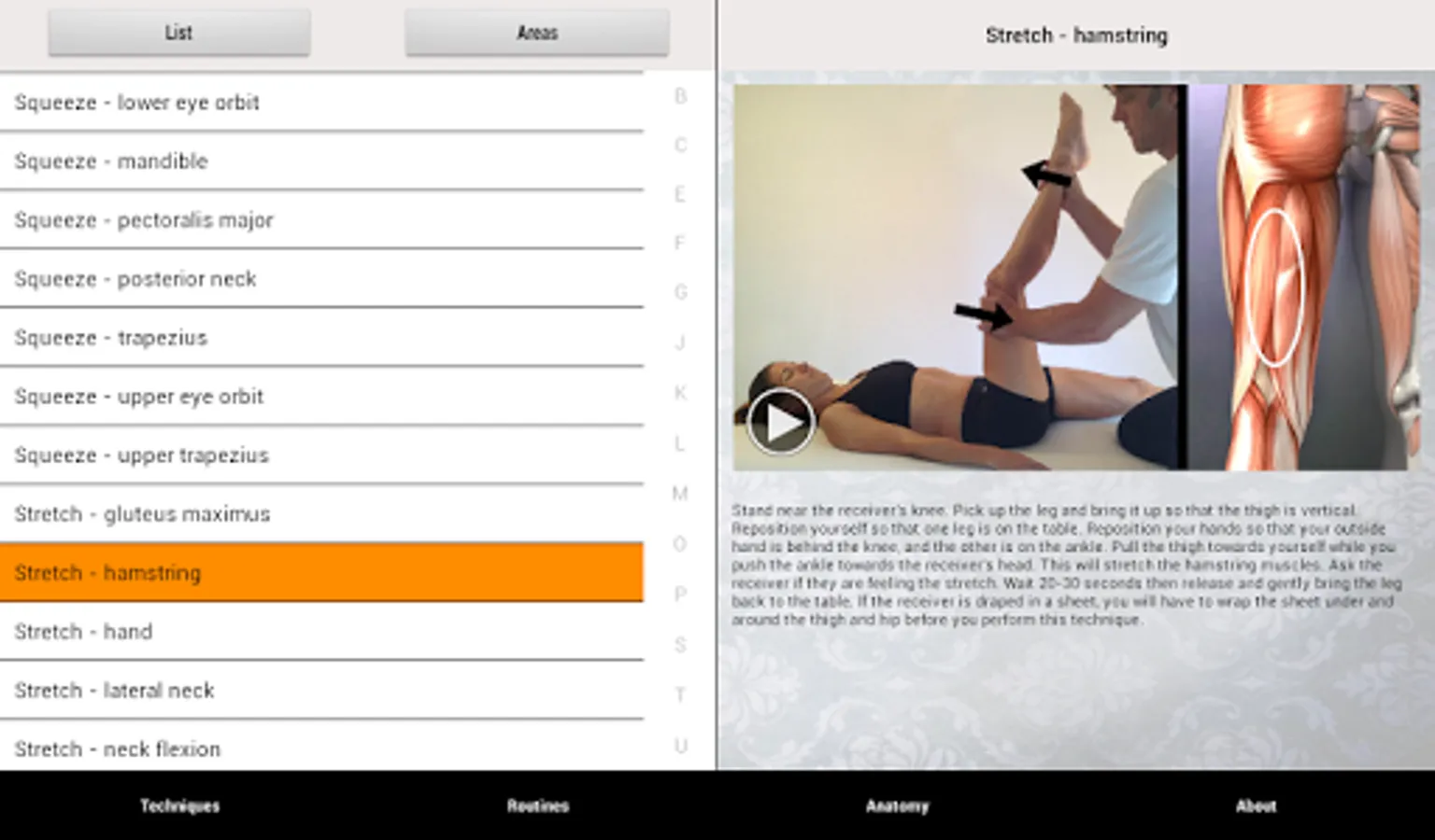 Each technique includes a video demonstration, a still image, and a text description. You can view techniques by body area or alphabetically.