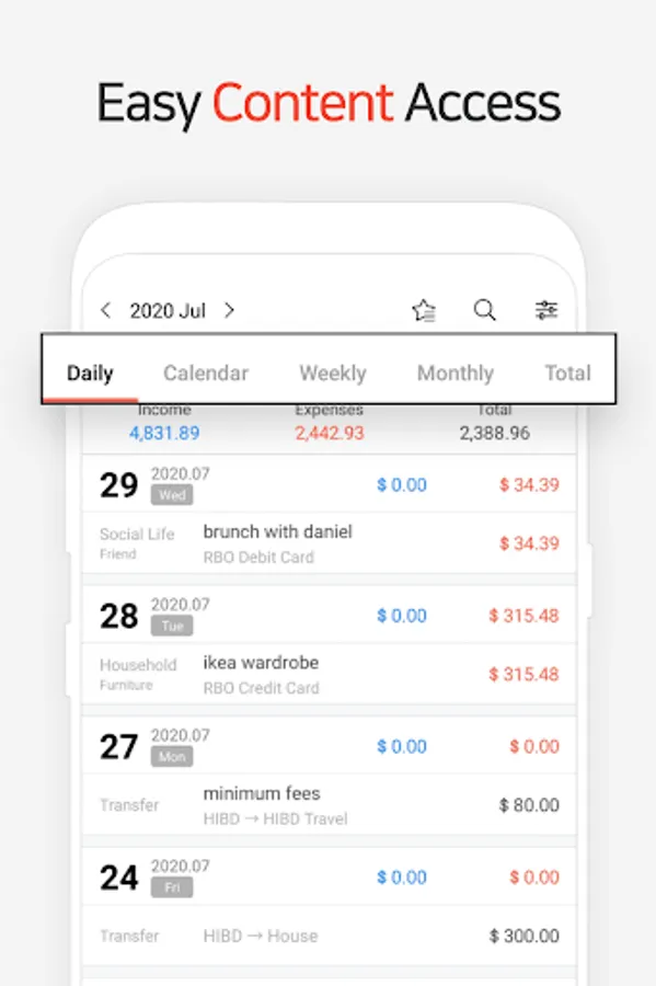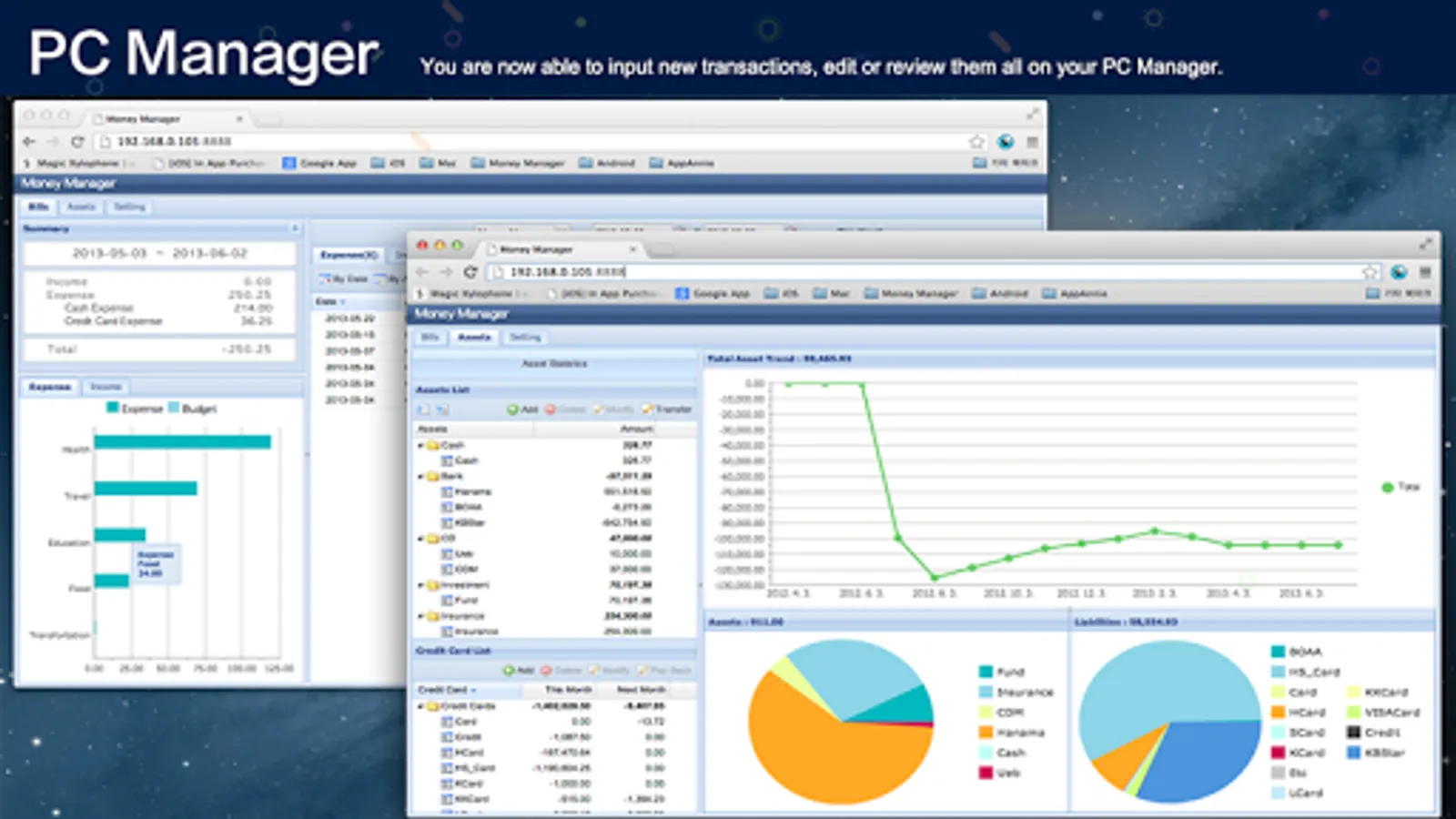 You can view ‘“Money Manager” application using Wi-Fi. You can edit and sort the data by date, category or account group on the screen of your PC. In addition, you can see fluctuations in your accounts indicated on graphs on your PC.
