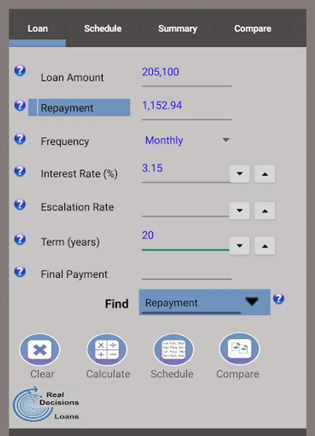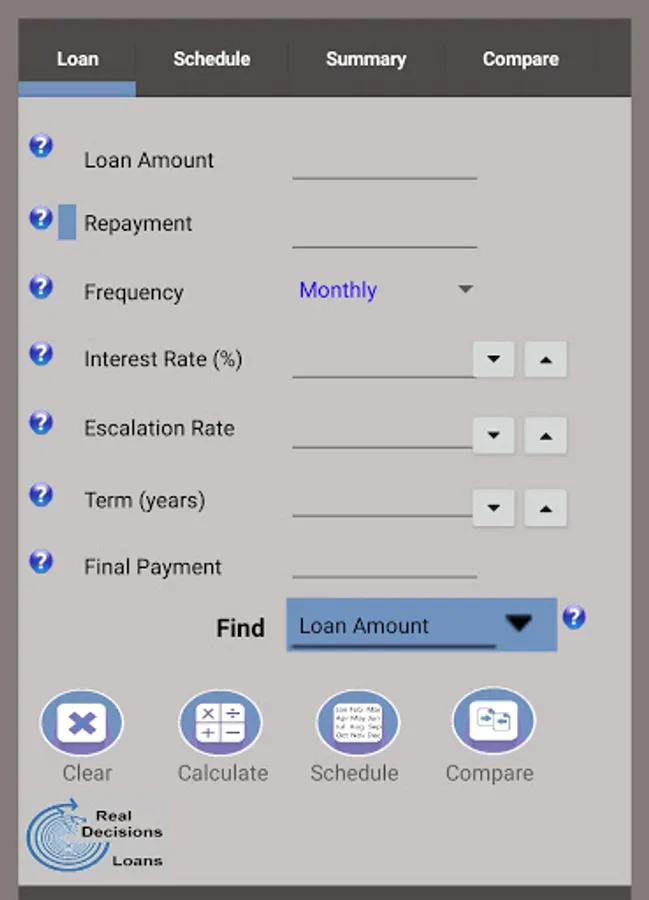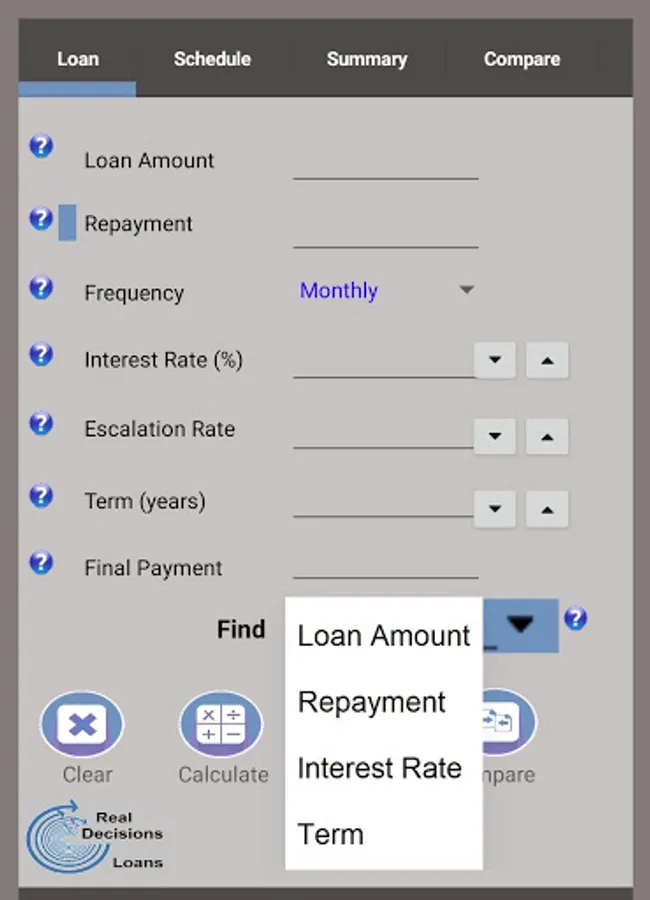2) You can find any missing element of your loan (Loan Amount, Repayment, Interest Rate, Term, or Final Payment), all using the same screen