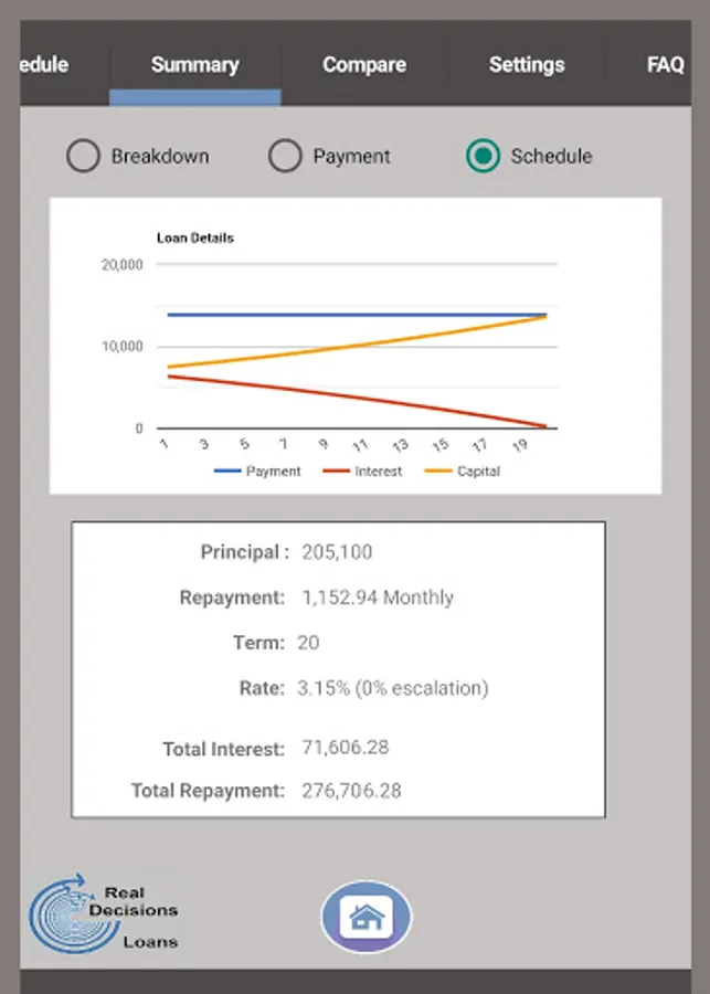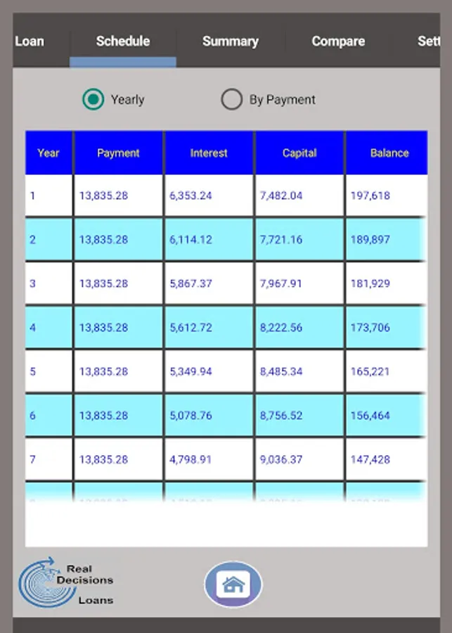 3) Shows a complete payment schedule – select an annualised summary or go for the full payment schedule of Payments, Interest, Capital paid and Balance
