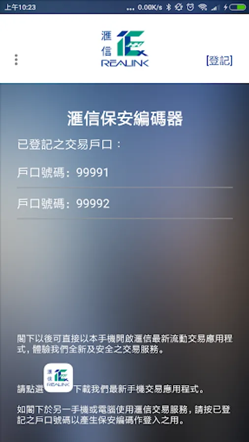 客戶可在同一裝置安裝本編碼器及匯信股票期貨報價交易程式(Realink iExcite),並於登入交易系統時,將自動取得對應[登入名稱]之保安編碼,讓客戶體驗我們既安全,又快捷方便之網上交易服務。