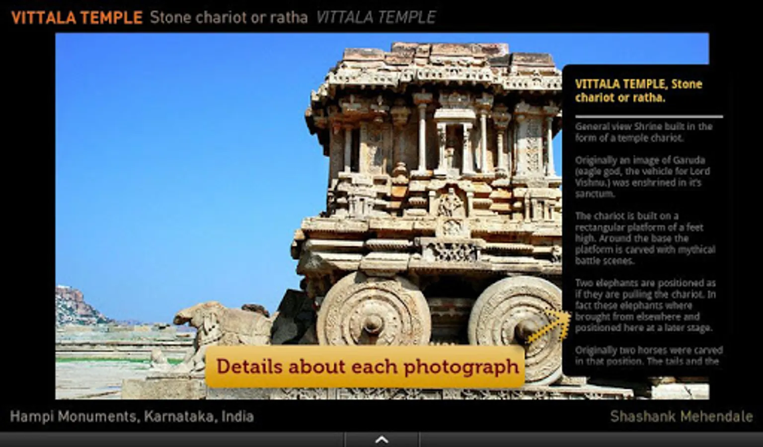 The Hampi eguide is a collection of more than 130 pictures that build a crisp story about the beauty of Hampi and showcase its many facets. It covers most of the important tourist spots and provides you detailed information of every photo.