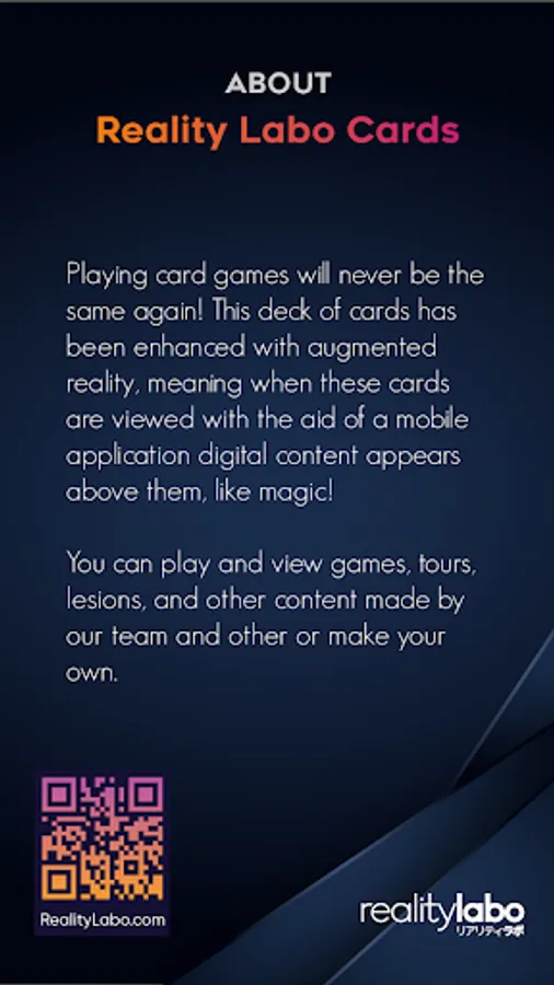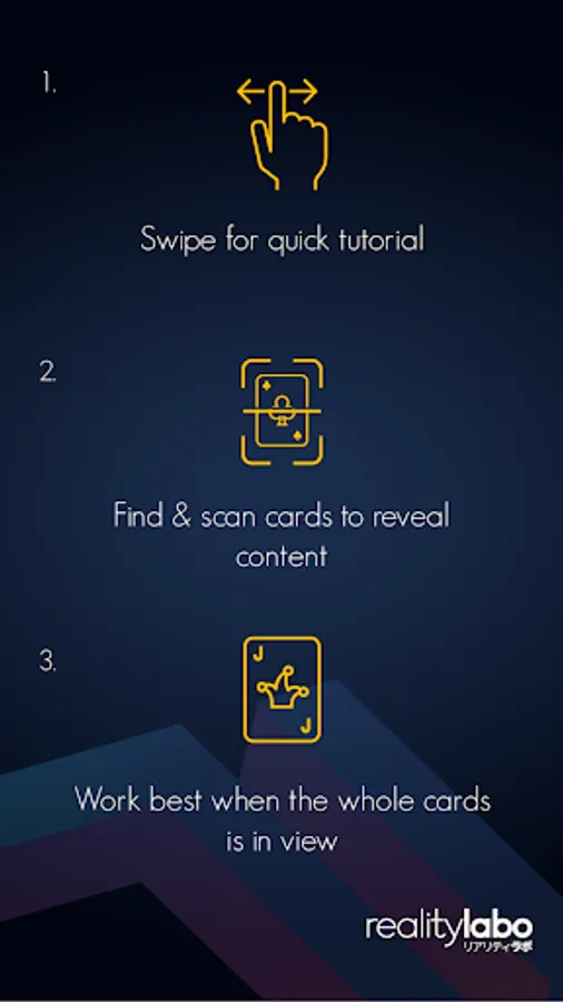 This application will require the use of a special set of playing cards. This card set is a standard 52 card deck that has been designed specifically for augmented reality. Reality Labo will recognize these cards and display digital contents on top of them in real time.