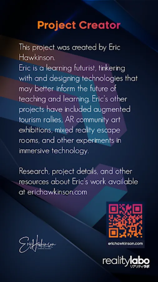 This project was created by Eric Hawkinson, a learning technologist living in Japan. The goals of this project are to find new and creative uses for augmented reality in learning, refine best practices of AR for fun and engagement, and research the use of AR in learning environments. You can find research and projects related to Reality Labo at https://erichawkinson.com
