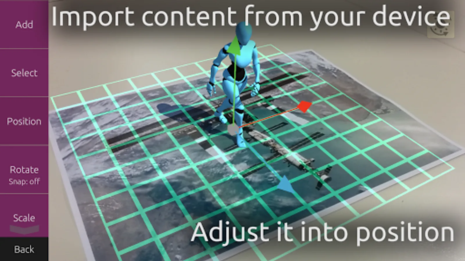 Load your own 3D models, animations and other formats from your device's storage and view in augmented reality.