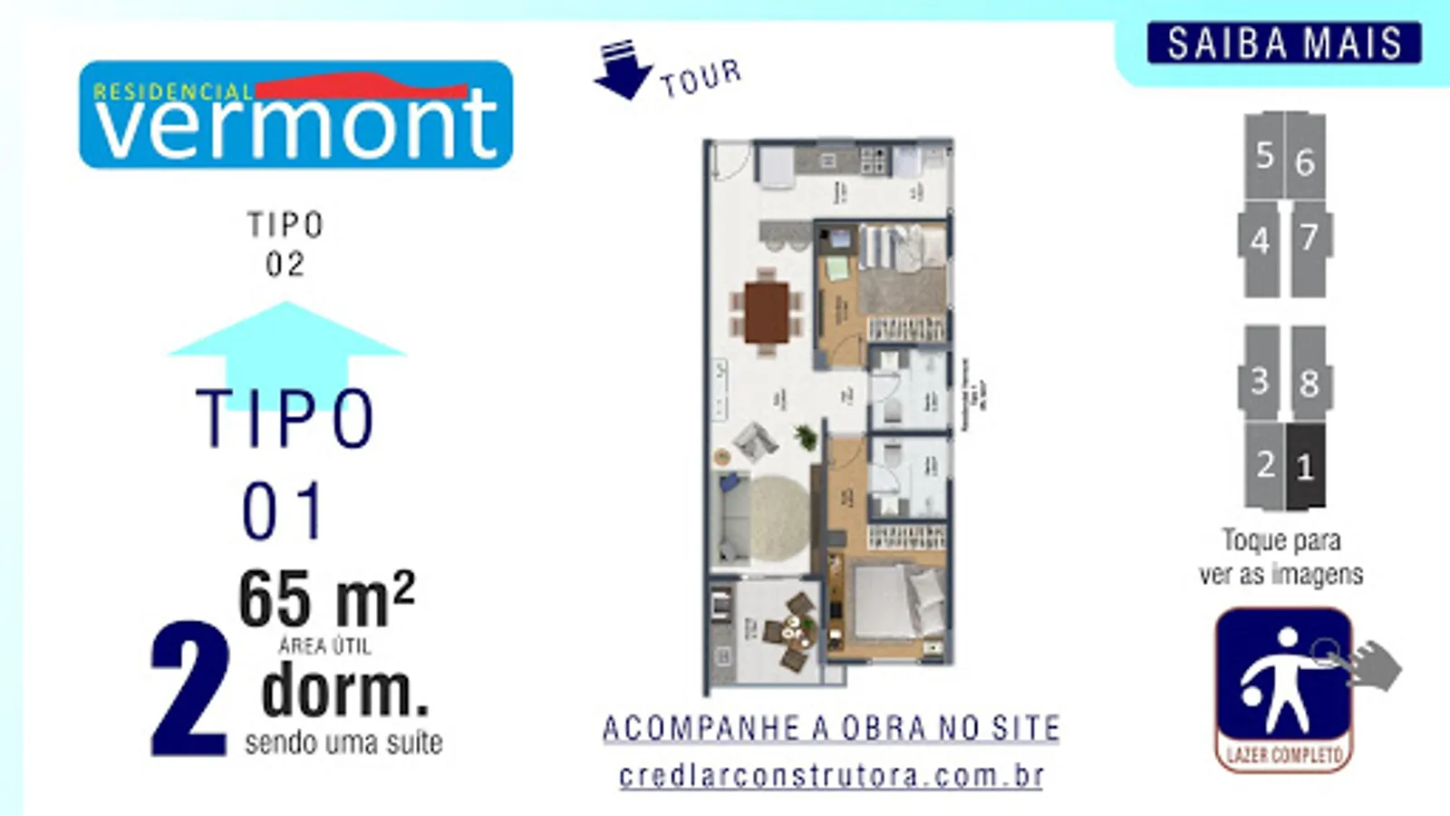 Apartments of 65 and 67m² with living room, gourmet terrace, kitchen, bathroom, laundry area and 02 bedrooms, 01 suite.