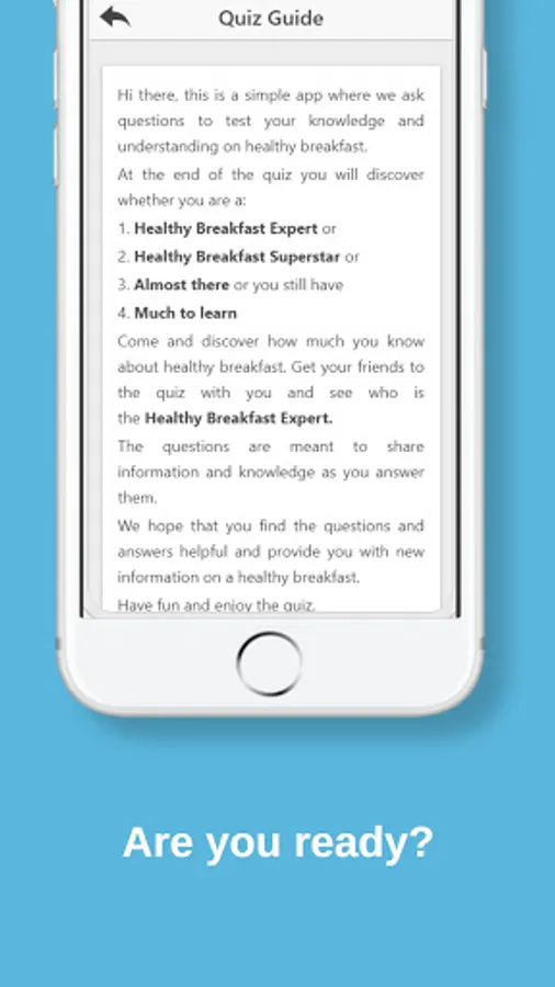 Free Trivia Game. Questions & Answers. Healthy Breakfast provides you with an app that you can use to discover and test your general knowledge on a healthy breakfast. The answers will help you to understand and make better decisions for your health and well-being.