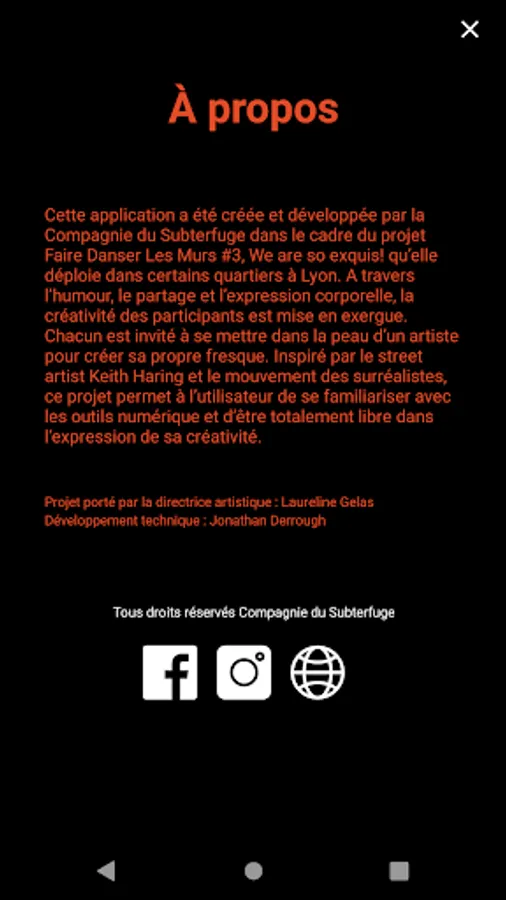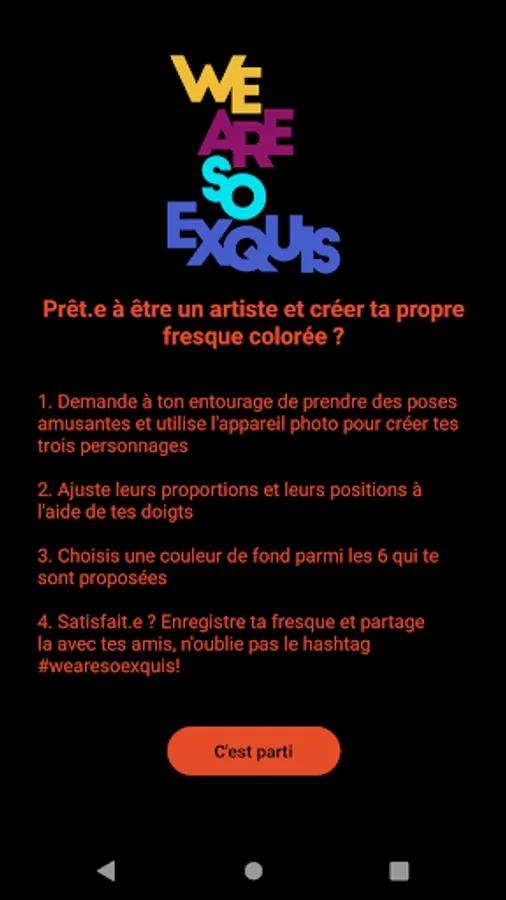 WeAreSoExquis! is an application to create colorful frescoes through a very simple creation process. It was proposed to you by the Compagnie du Subterfuge, a multidisciplinary company that co-constructs each of its projects with the populations, mainly in urban areas. Inspired by street artist Keith Haring and the surrealist movement, this project allows you to familiarize yourself with digital tools and to be completely free in the expression of your creativity.
