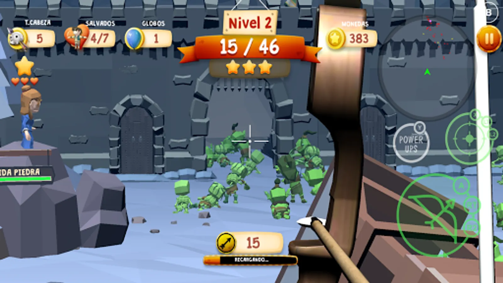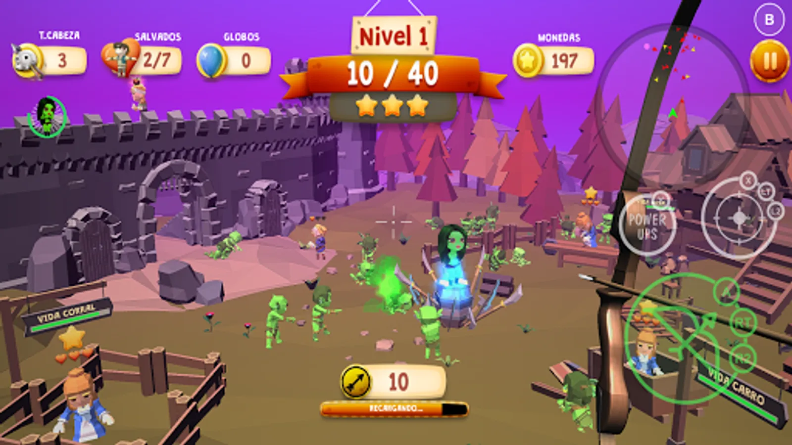 Explore diferents worlds fighting and saving the King and the Queen from the zombie apocalipsis. Rescue the villagers and the maidens helping them to escape from this threated tsunami of undead that has invaded their homes.