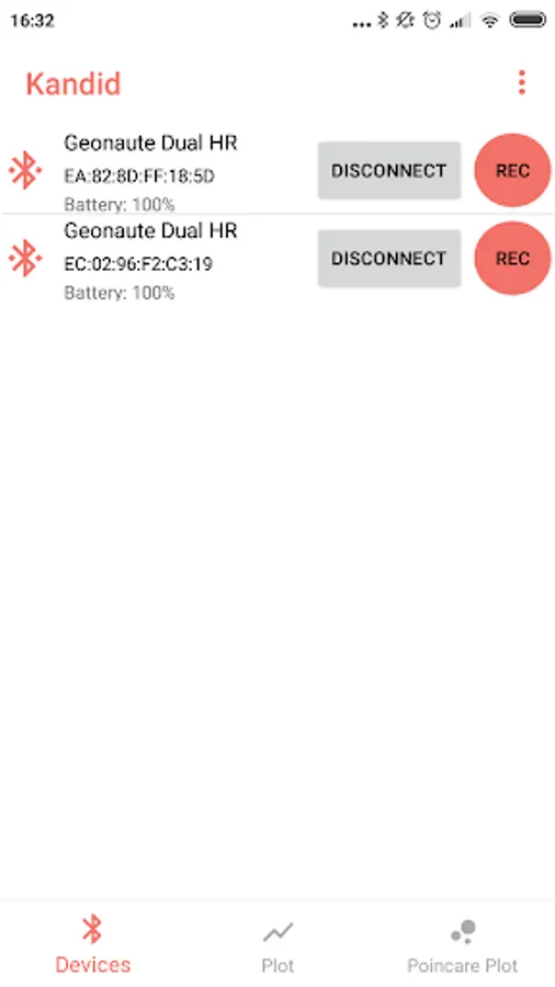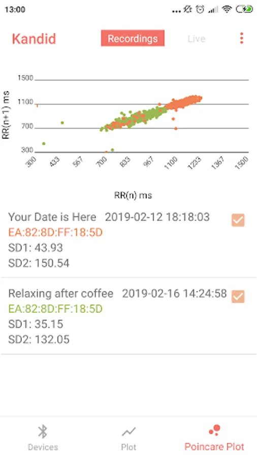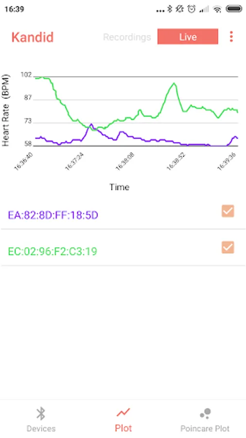 Allows you to stream and record heart rate data from multiple Bluetooth heart rate chest straps simultaneously. Easily view, log and compare Heart Rate/SDNN/RMSSD/NN-Intervals(SD1 & SD2) data. Also allows you to overlay plots over other apps. Please visit https://github.com/realta-engineering/KandidValidation for more info on algorithms and validation