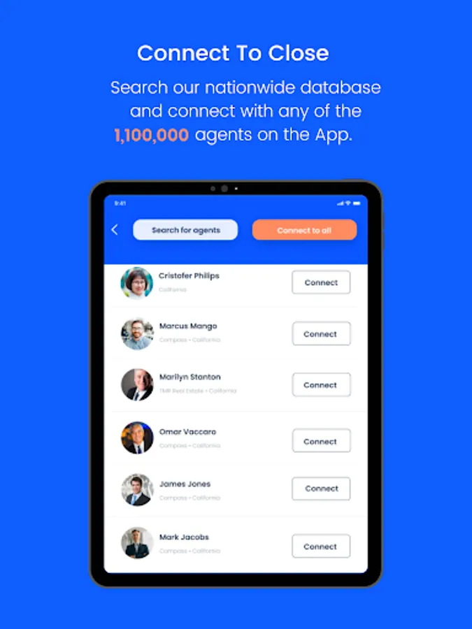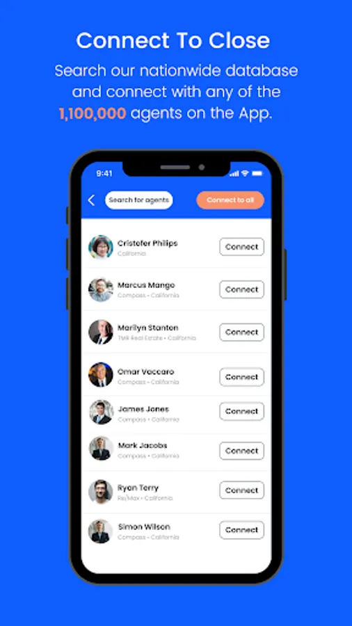 Search our nationwide database to connect and contact any of the 1,100,000 agents on the App.