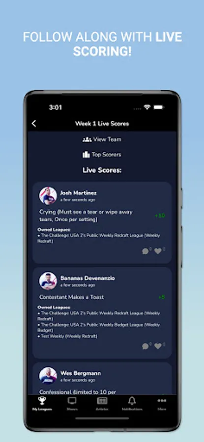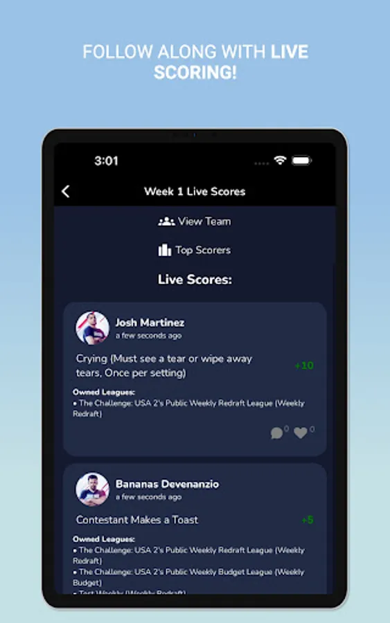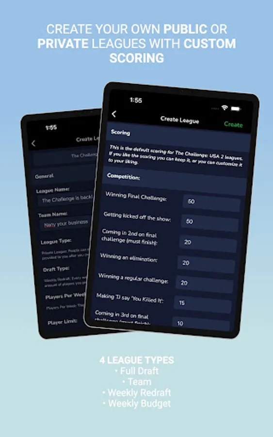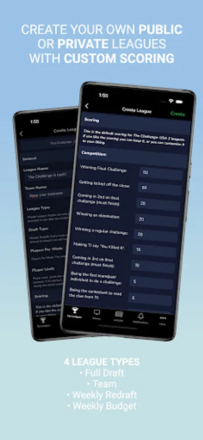 You can create a fantasy league from any of the shows we provide on the app (The Challenge, Survivor, The Bachelor, The Bachelorette, Bachelor in Paradise, The Amazing Race, Big Brother) that are fully customizable. Each show has its own scoring categories that you can use to customize the league to your own liking. Show scores will be updated 24-48 hours after the end of each episode.