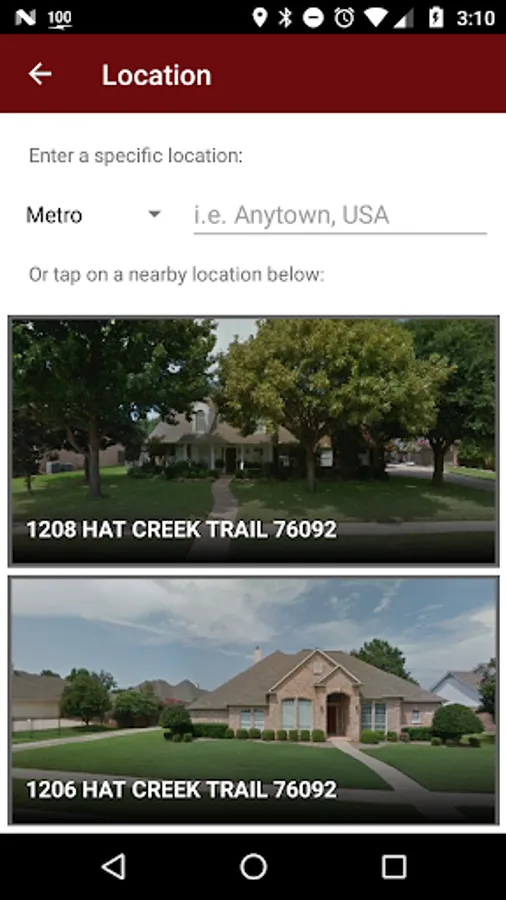 Choose from a list of nearby homes or enter a specific metro, city, ZIP code, or address