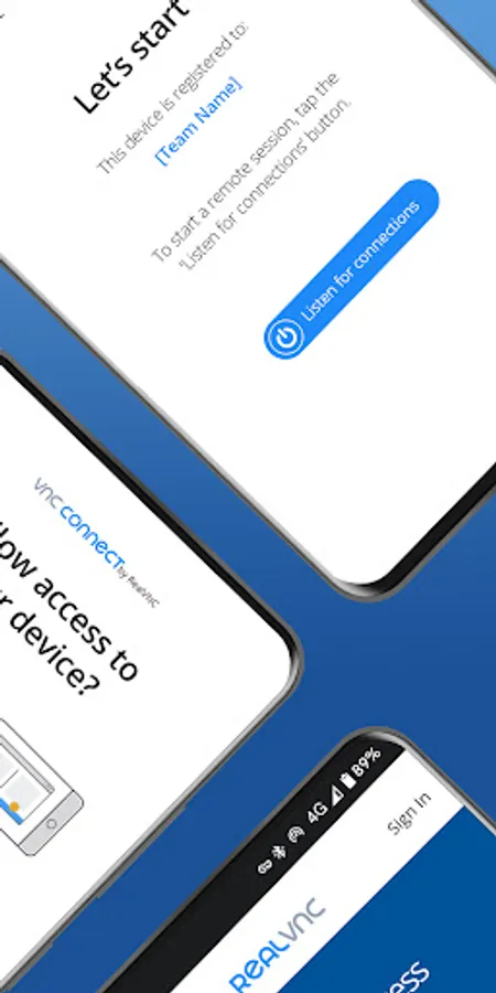 • Devices that are managed using a mobile device management (MDM) tool can be pre-licensed by the IT Team. A session can be started without a session code, but the mobile device holder still needs to authorize the connection. This requires a RealVNC Connect Enterprise Device Access subscription.