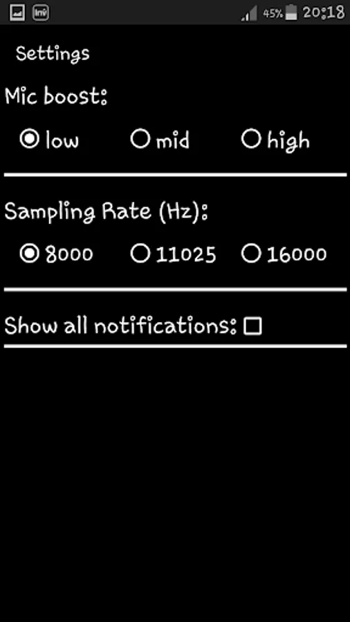 To achieve better sound quality, users may choose higher sampling rate under Settings. In some phone models, voice delay improves (reduces) with higher sampling rate. Some phone models may not perform well with higher sampling rates, as it requires higher CPU processing power.