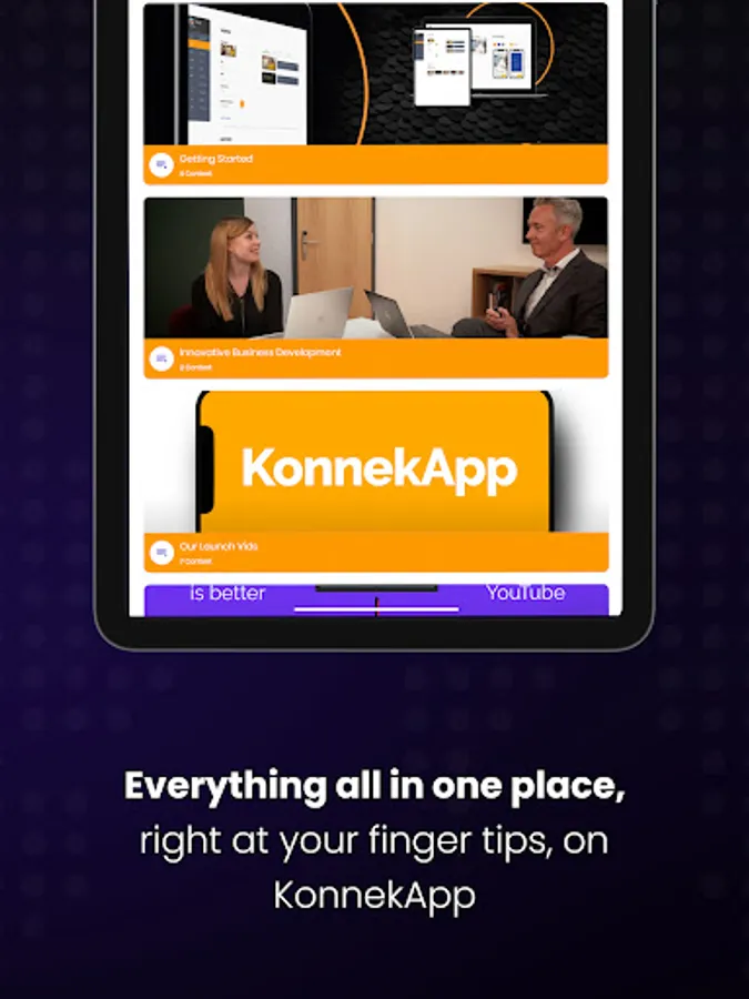 KonnekApp lets you watch exclusive content curated for you by your favourite organisations, brands and businesses. You can also contact them on email or phone. We currently support 7 languages including English, Spanish, Simplified Chinese, German, French, Japanese and Italian.
