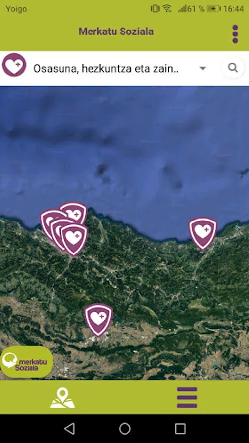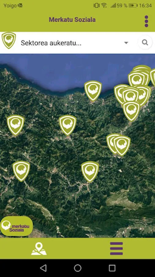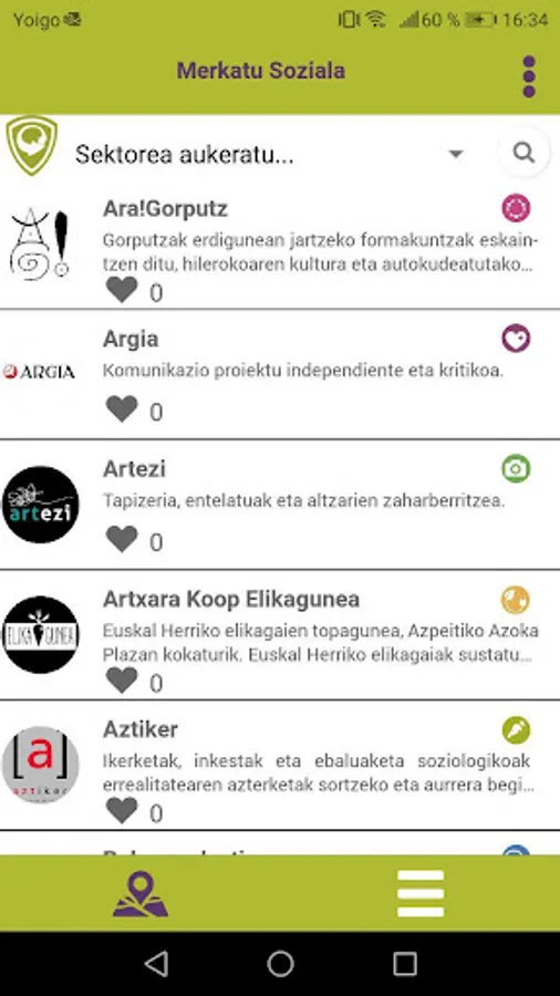 App-ak interaktibo bat du map, eta bertan erakundeak geolokalizatuak agertzeaz gain, jardinuera-sektorearen arabera hautatu ditzakezu. Halaber, entitateak ere zerrendatuta ikus daitezke.
