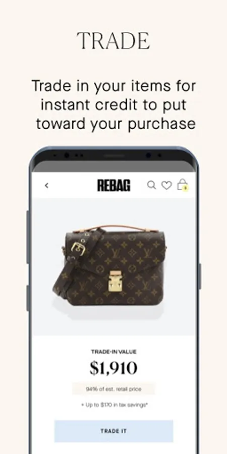 With Clair Trade, you can buy and sell luxury items in just one transaction. Trade-in your once-loved items for credit worth 25% more than our cash offer, and benefit from tax-free shopping.* Then, put the trade-in value toward your new Rebag purchase – you only have to pay the difference!