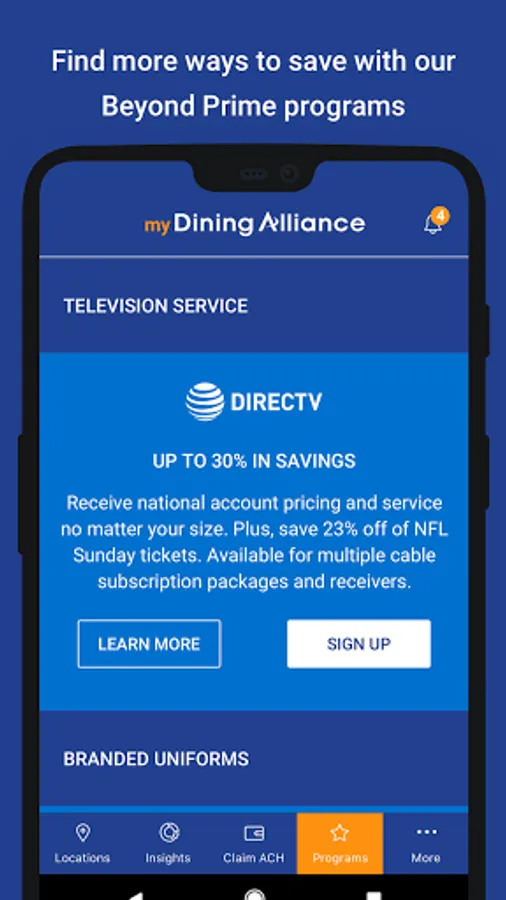 The Dining Alliance app provides easy access to our many Beyond Prime Programs, which offer a variety of ways to save money on all non-food aspects of your restaurant, including office supplies, pest control, recycling, credit card processing, DirecTV subscriptions, C02, and more. Sign up with One Touch in the app and add these valuable savings programs to your account.