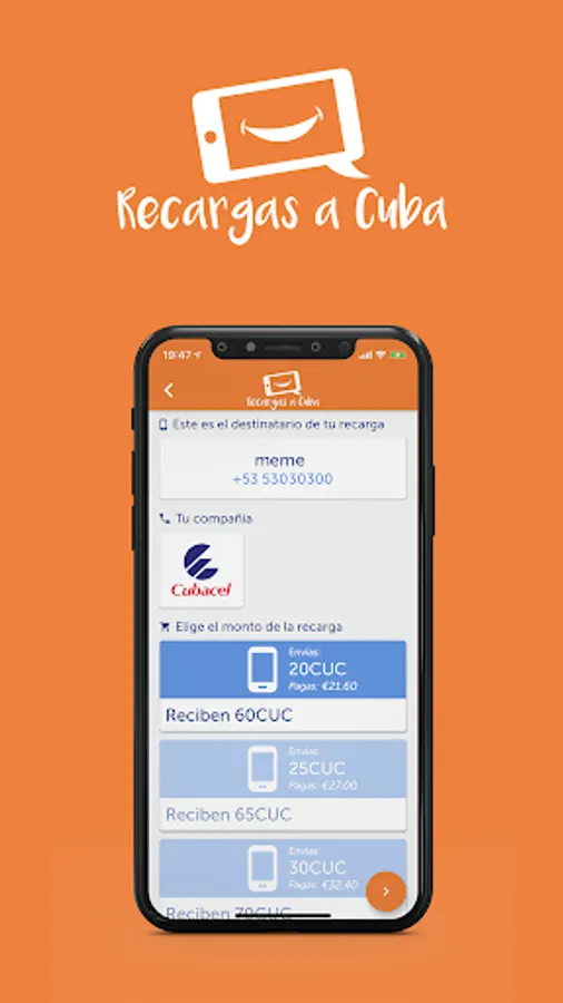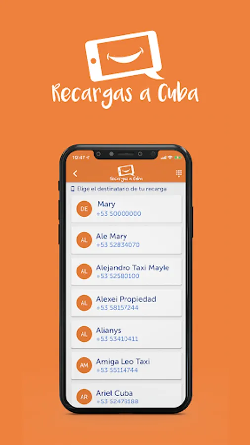 Recharging Cuba has never been so easy. Select the contact you want to recharge your cell phone directly from your contacts directory or enter your phone manually.