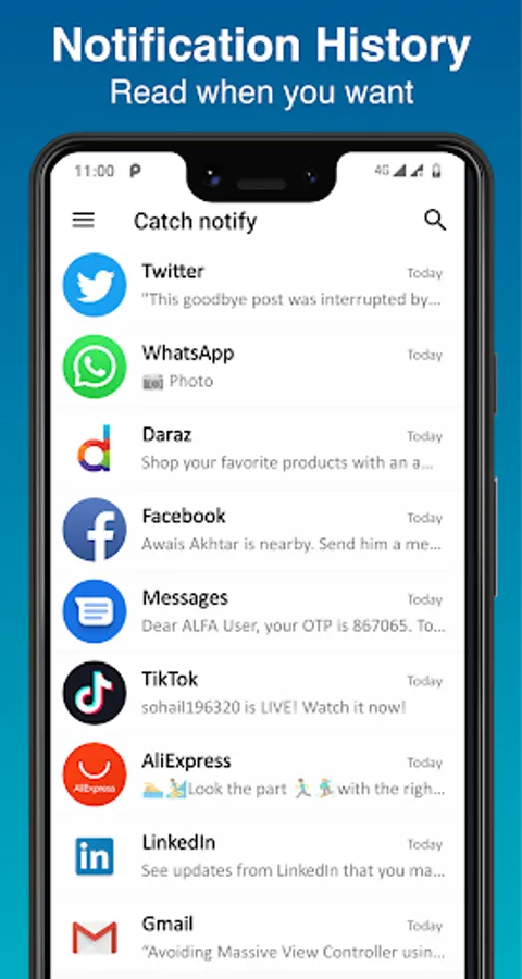 Worries of lost notification is no more Catch notify help you to save notification or instantly deleted message so most of you day by day problem is solved. Catch notify will securely saved all of you incoming notification to private storage in your mobile device. The notification stay on your devices as long as you want to retain so it is never automatically deleted. Catch notify will never transmitted any parts of notification to any public storage or server so you notification safe securely in your device.