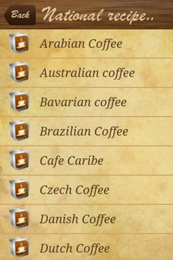 This application contains a large number of coffee recipes from around the world. By following them, you present all the unforgettable moments, tasted cooked your coffee. Also in the application, you'll find plenty of interesting things that will be updated and added to.