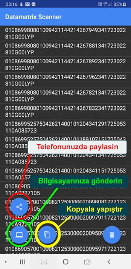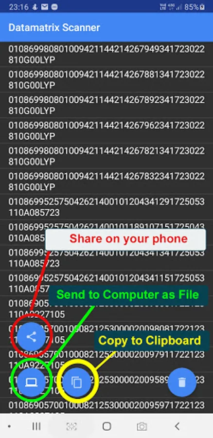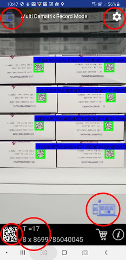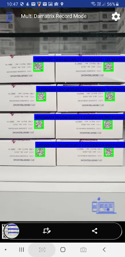 Data Matrix stock counting, multiple data matrix reading at the same time, transfer multiple data matrix codes to pc with one click, Can be used as a 2d barcode scanner (for datamatrix and ean). Can share multiple data matrix codes by email, whatsapp or similar.