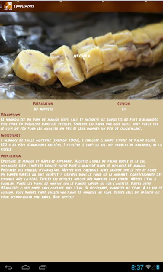 Partager un repas au Cameroun est un acte de fraternité, d'amitié, mais surtout un acte d'amour. C'est pourquoi nous avons cree cette application afin de vous aider a realiser certains repas camerounais bien connus. Apprenez comment cuisiner le Sanga, Poulet DG, Kontchap etc.. avec cette application