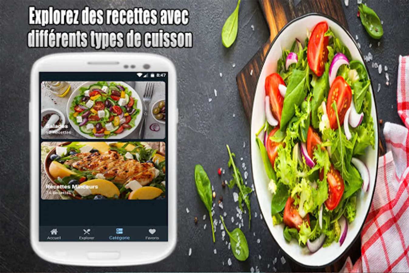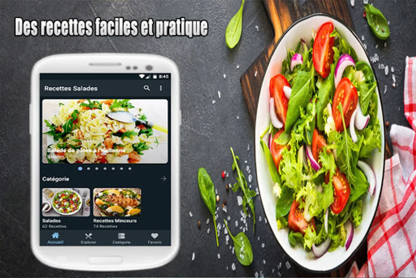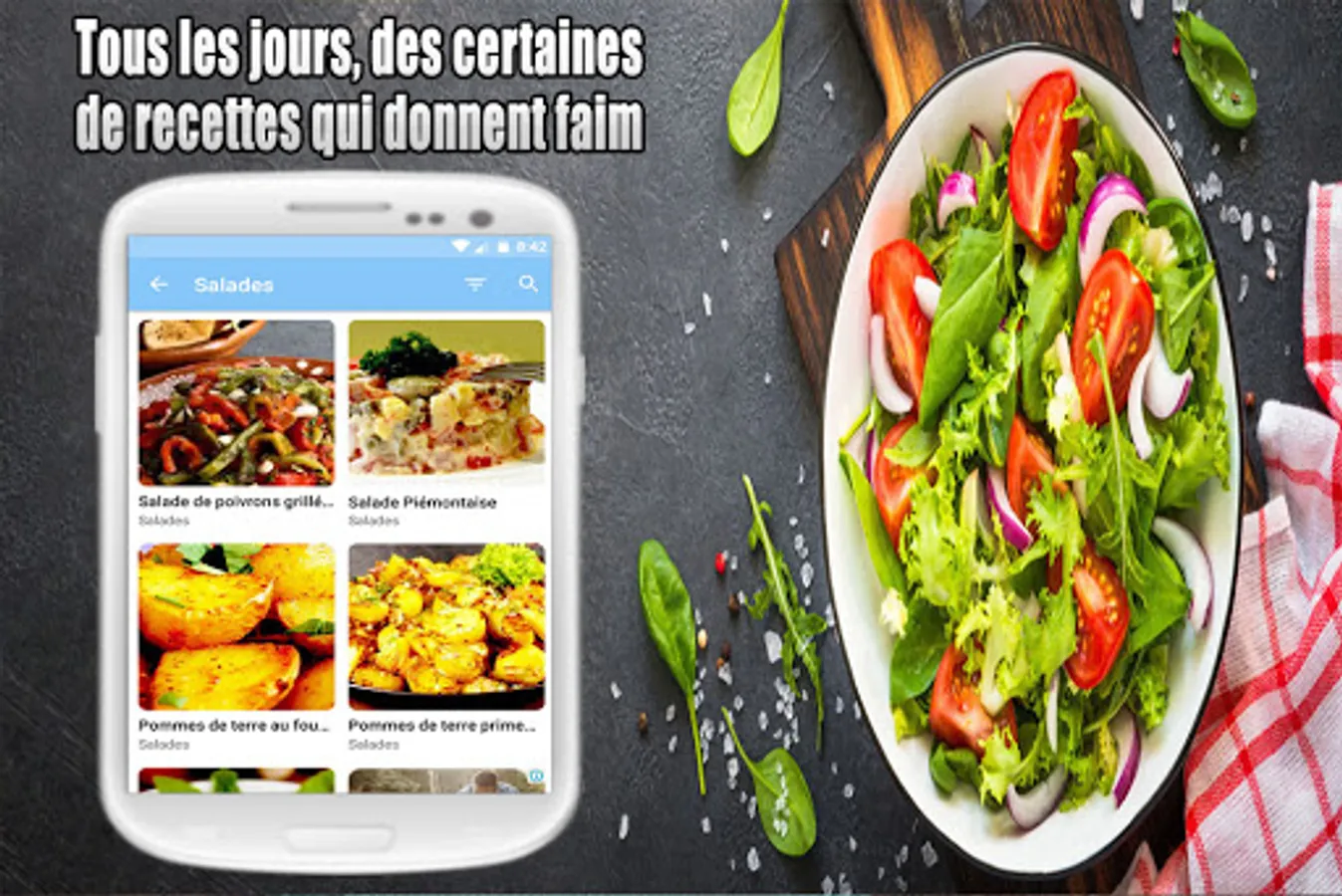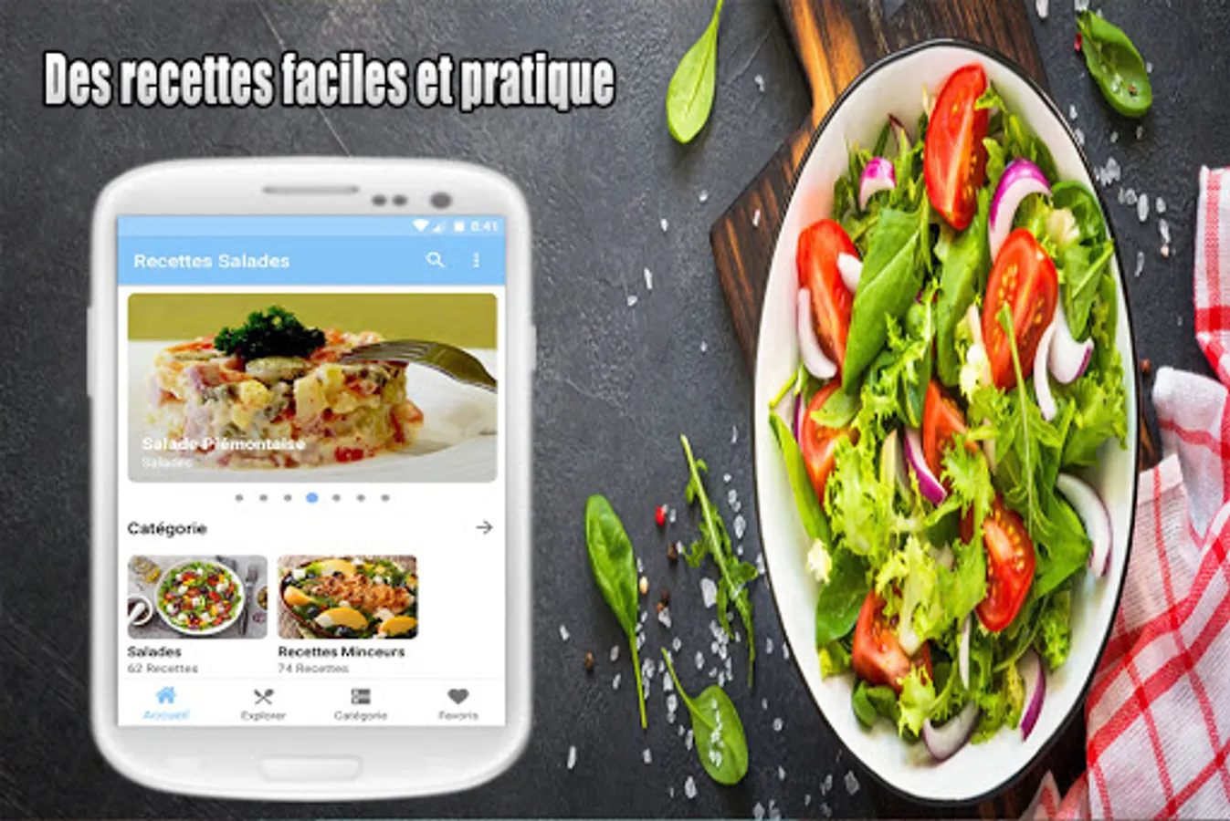 Salade verte ou composée, aux fruits, salade de riz ou salade de pâtes? Besoin d'idées pour une laitue, une scarole, une iceberg, du cresson, une roquette ou des épinards? Nous avons des recettes pour des salades de betteraves, pommes de terre, crevettes, et aussi du taboulé. Régalez vous avec une salade niçoise ou une salade grecque... tous dans notre Recettes Salades app.