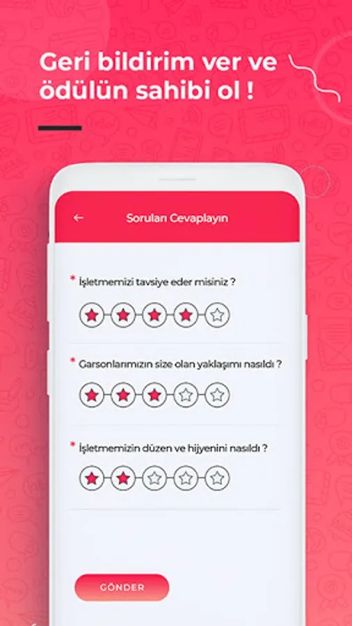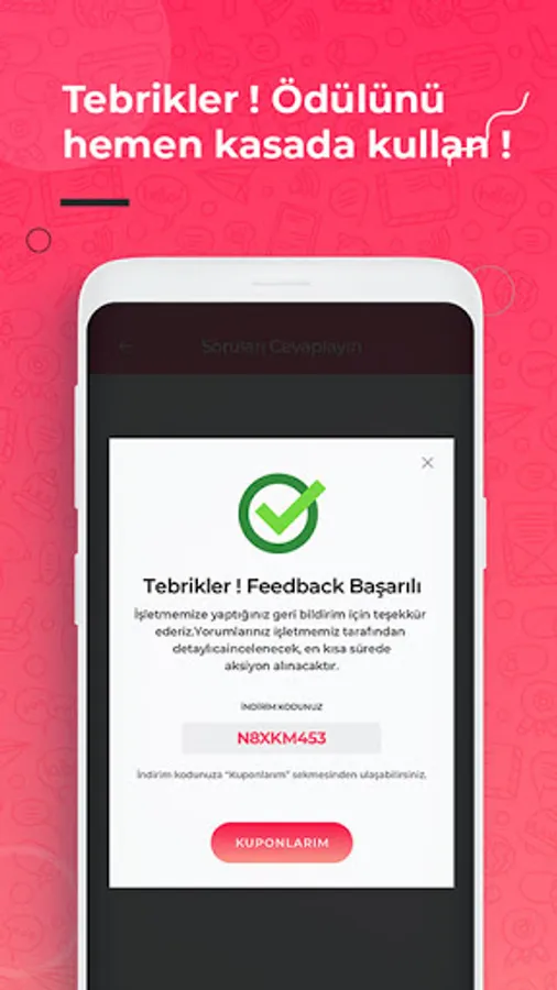 Bunun için uygulamaya giriş yapıp ,bulunduğunuz işletmedeki QR kodu okutmanız ve kısa soruları cevaplamanız yeterli olacaktır. Geri bildiriminiz sonucunda elde ettiğiniz indirim kuponunuzu