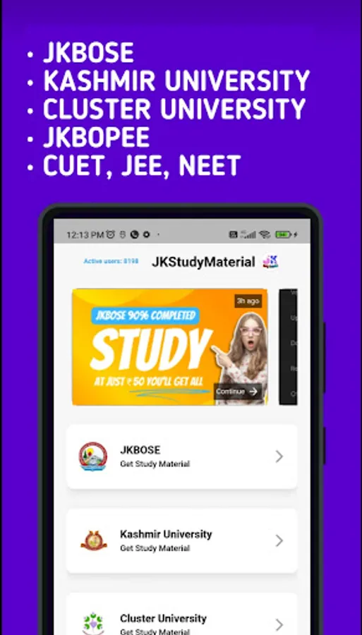 Explore an extensive collection of study materials, including previous papers, guess papers, comprehensive notes, syllabi, MCQs, and recommended books. Our app covers subjects for various exams and courses, such as JKBOSE, JKBOPEE, Kashmir University, Jammu University, NEET, JEE, IGNOU, and CUET. No matter which educational institution you're affiliated with or what exam you're preparing for, you'll find valuable resources to aid your learning journey.