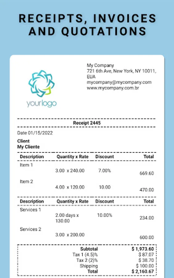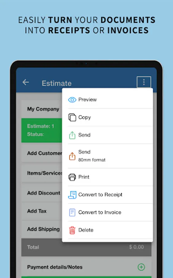 Create and send receipts, invoices, estimates and credit notes of services and products.