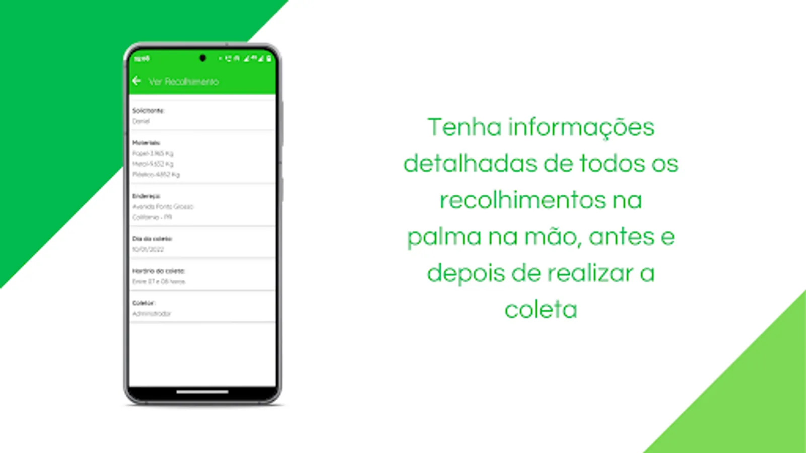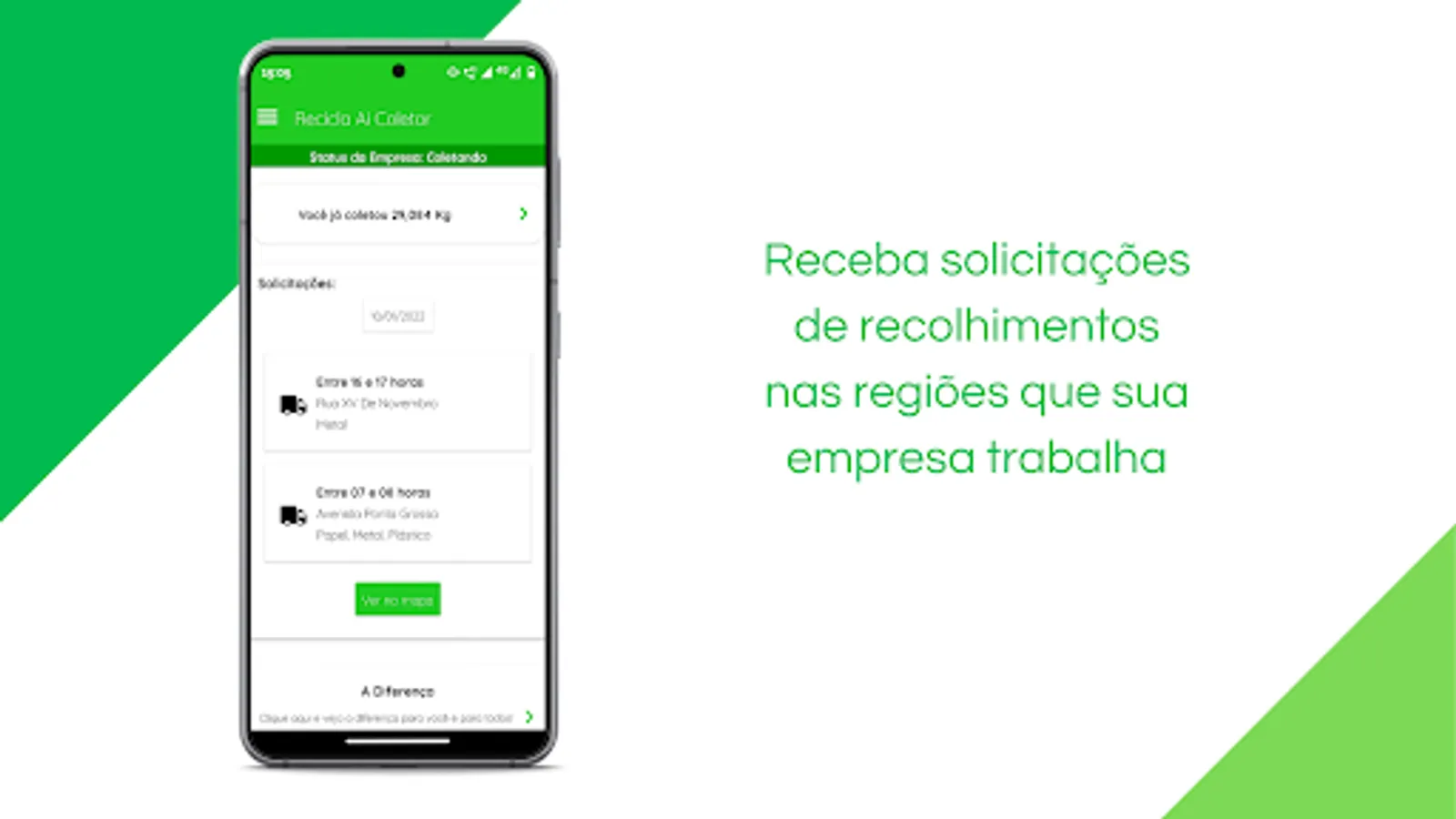 With the Recycle There Collector app, your company can only win! With it, you and your waste collection organization have access to various collection requests from people in various regions. That is, you will know where to collect, what you will collect and at the time your company determines. In addition, you will have a detailed control tool of how many kilos of waste are entering the organization. A closer and more prosperous relationship with those who generate waste.