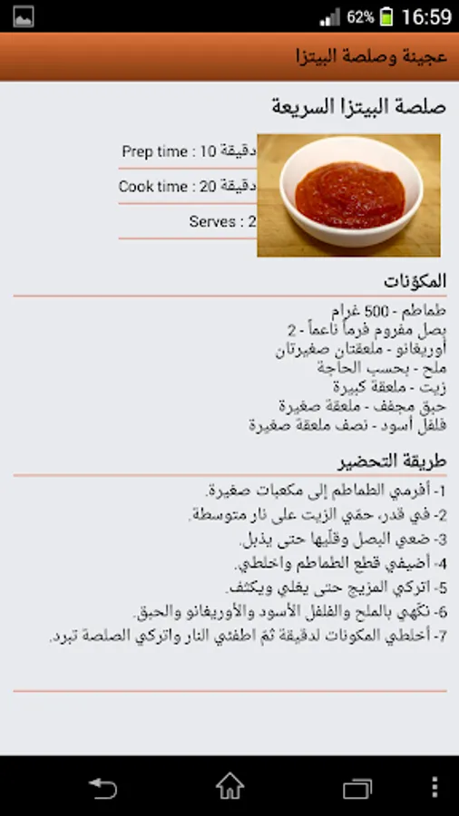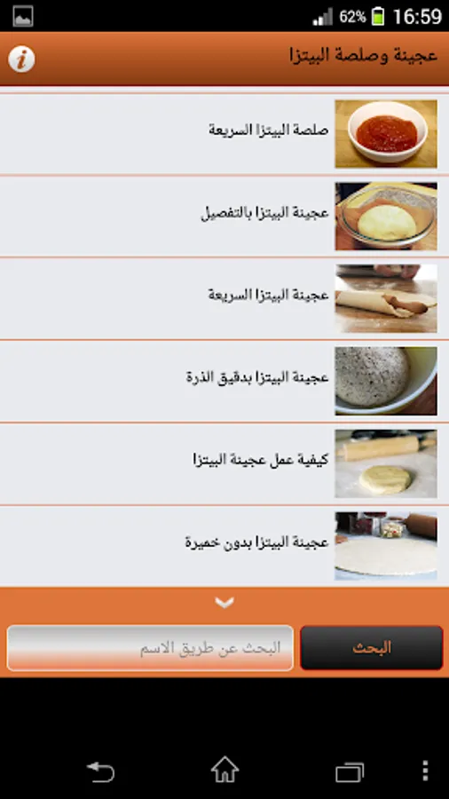 ✓ امكانية البحث عن وصفة من عجينة وصلصة البيتزا في قاعدة البيانات.