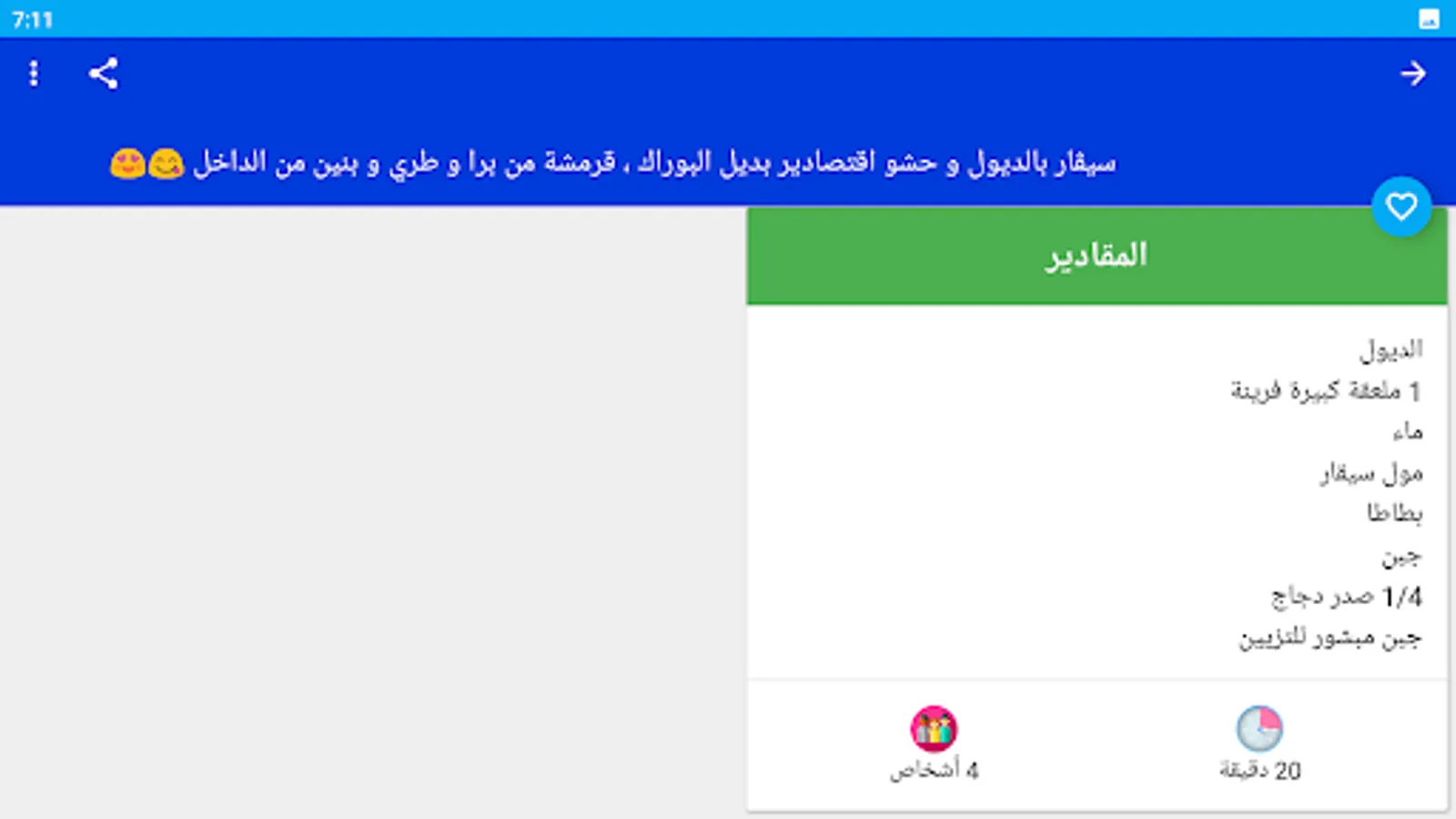 The application of cooking and sweets recipes without the net contains more than 200 new traditional and economic cooking recipes from Algeria, Morocco, Tunisia and from the countries of the Levant prepared by the finest chefs, and contains the most famous recipes from Arab kitchens from easy and quick sweets and the easiest delicious and delicious recipes and As well as the method of preparing new and economical dishes and sweets, which will impress all tastes, and in a simple and easy way of preparation, which is constantly renewed, as you can use it without the Internet.