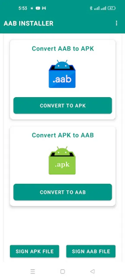 AAB Installer provides you to convert '.aab' file to '.apk' file and '.apk' file to '.aab' file. This app allows to install AAB file in Android device. This application does not edit or change the AAB or APK file. It provides a platform where you can install an AAB file. This is necessary for developers because sometimes a sign aab may contains some error. So , this application is helpful for developers where they can easily convert their aab to apk and apk to aab. AAB installer also provides the feature to sign the app with a test key or custom Keystore. Here we have described some feature of AAB Installer App.
