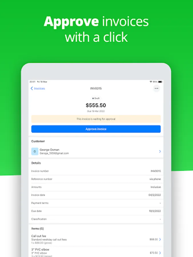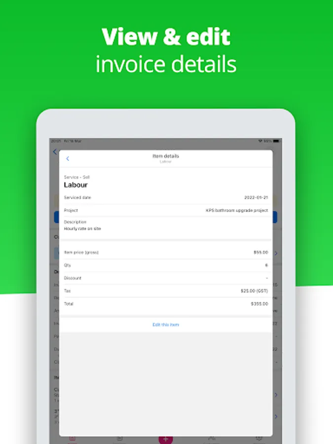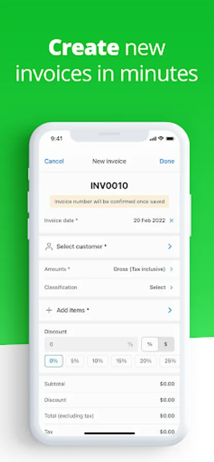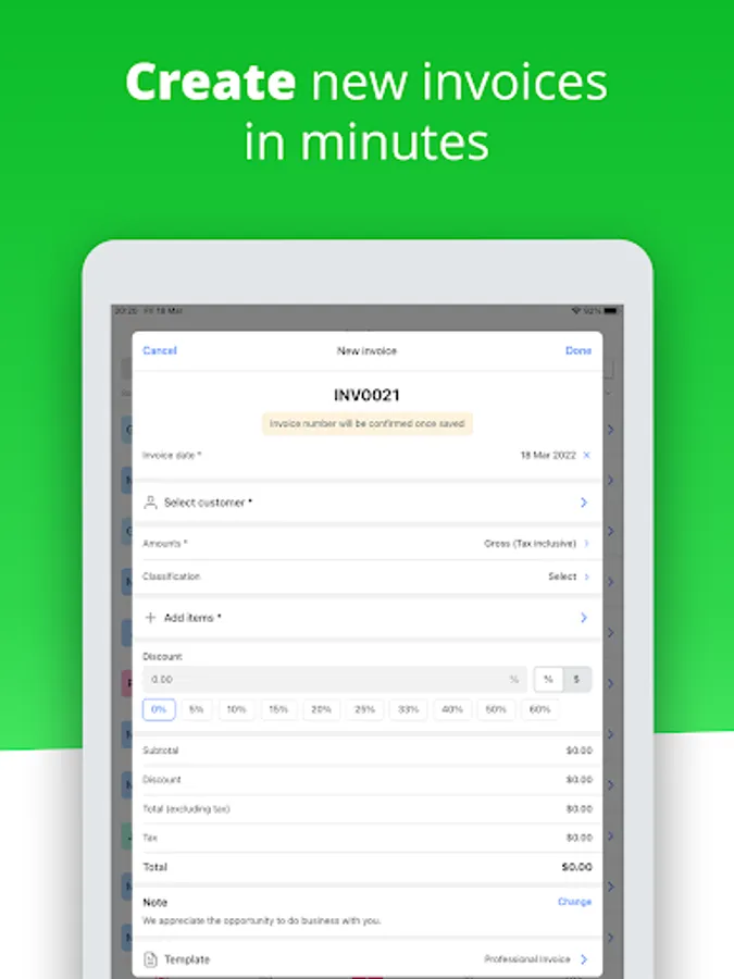 • Customise invoices including tax, discount, terms, classifications, service date and messages