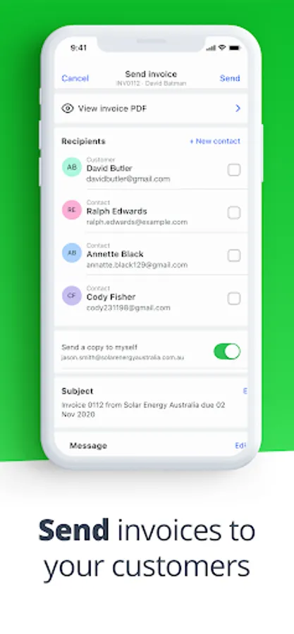 • Email invoices to customers via email or share Apple AirDrop and other apps