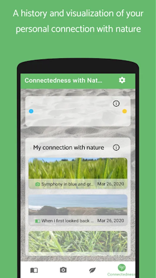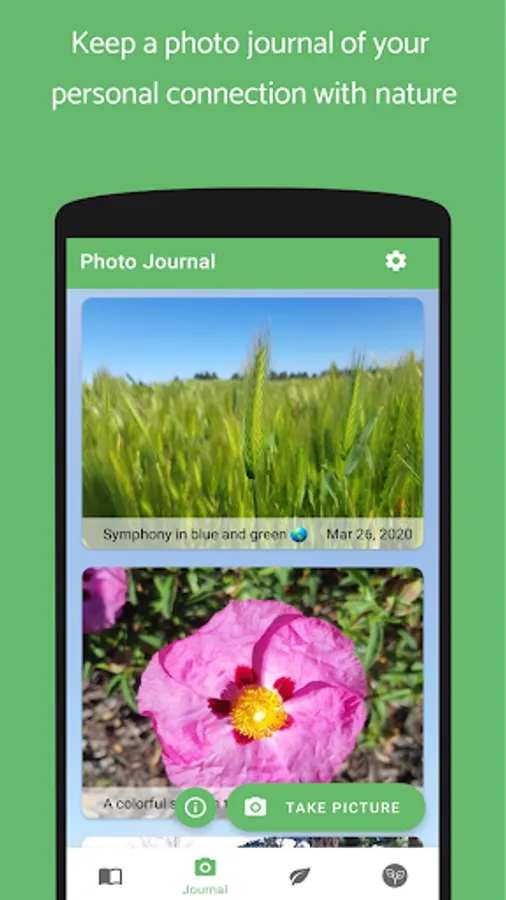 - The app enables users to keep a photo journal of their personal connection with nature and so strengthen their bond with nature.
