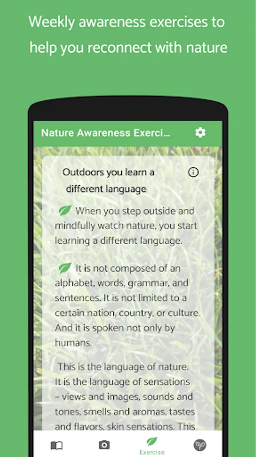 - With simple mindfulness exercises the app helps users further refine their nature observation capacity and connectedness.